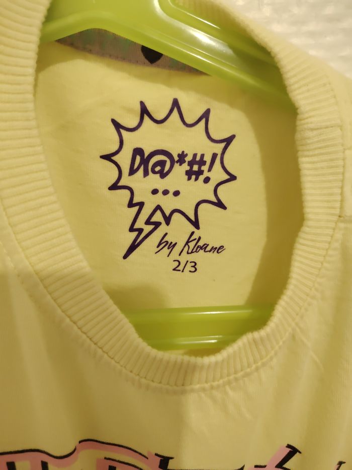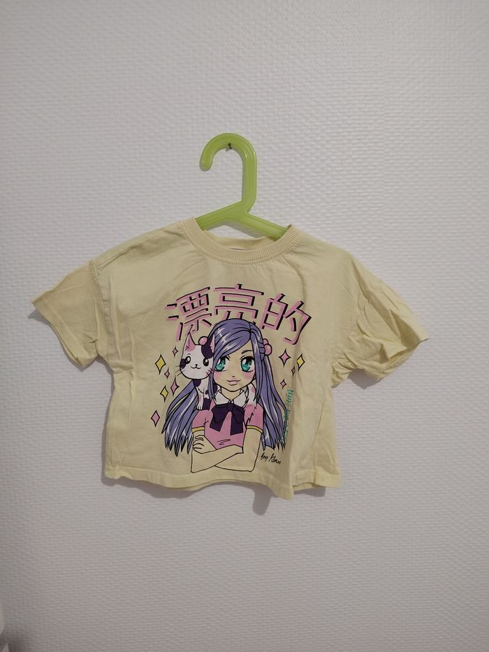 Joli tee-shirt fille manches courtes, coloris jaune pastel, avec un motif manga/anime représentant une petite fille et son chat 🐱✨