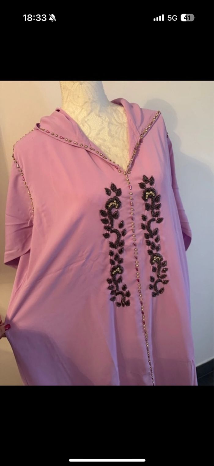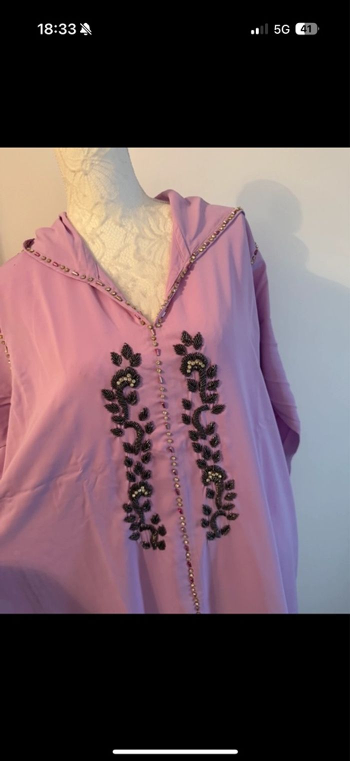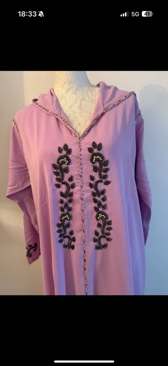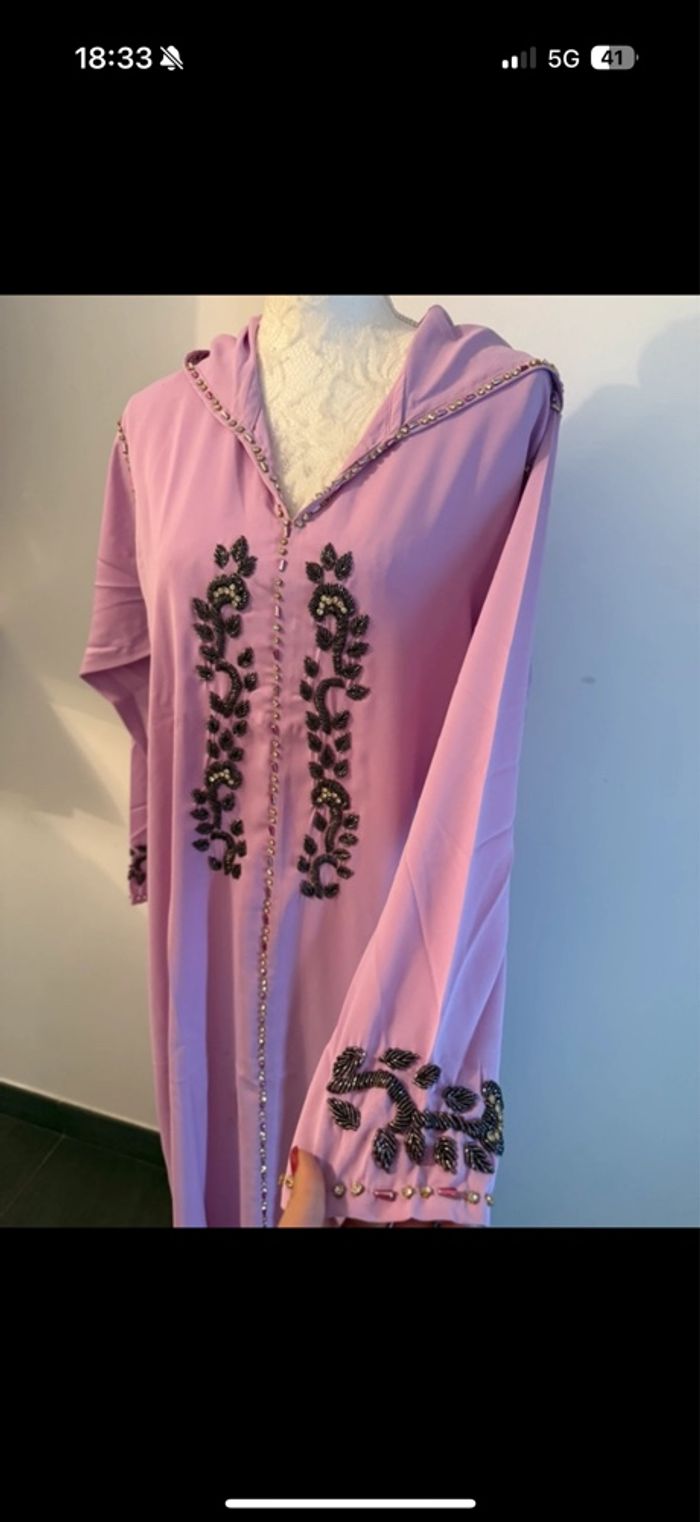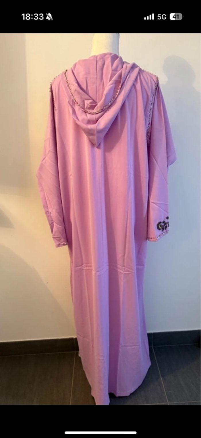 🌸 Élégante jellaba rose avec broderies perlées violette.