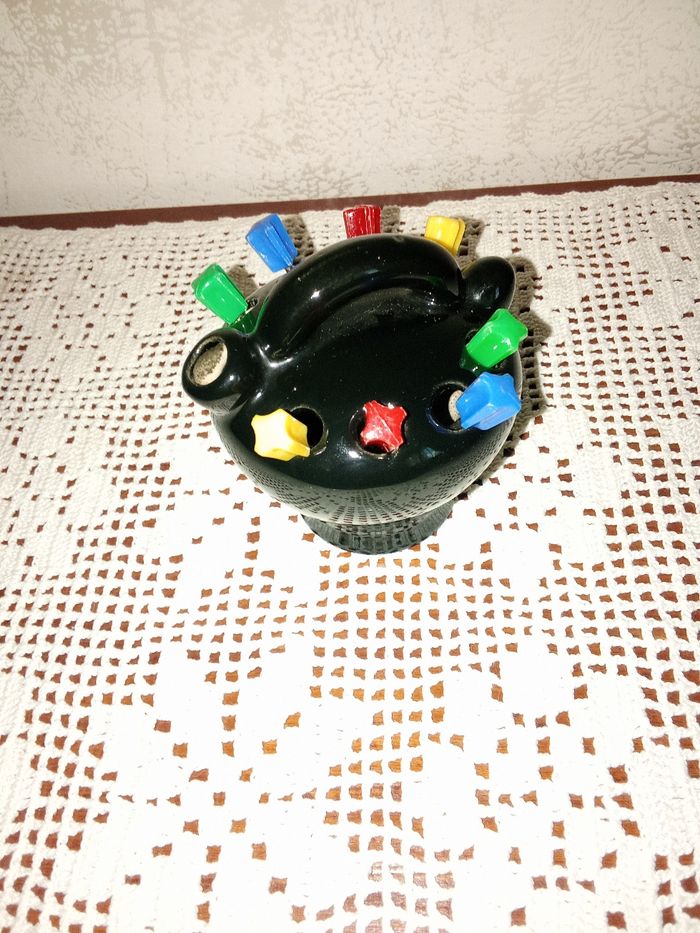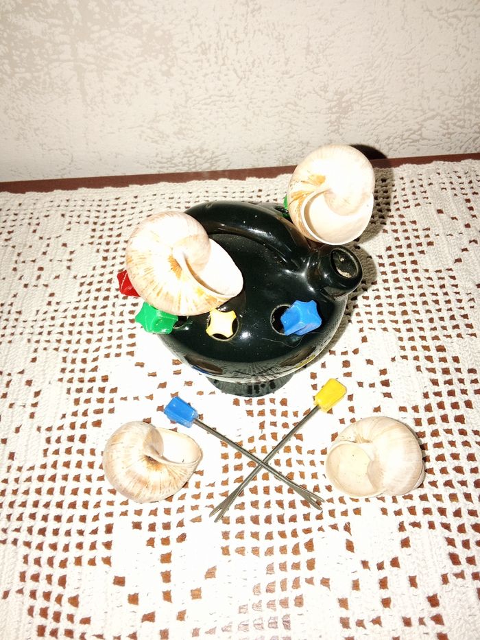 8 fourchettes à escargots dans leur râtelier Râtelier en céramique Hauteur et diamètre 9cm Longueur des fourchettes: 7cm