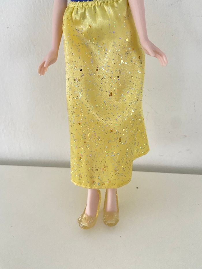 • Blanche-Neige : version moderne avec bustier bleu métallisé moulé (détails en relief), jupe jaune pailletée et chaussures dorées transparentes.