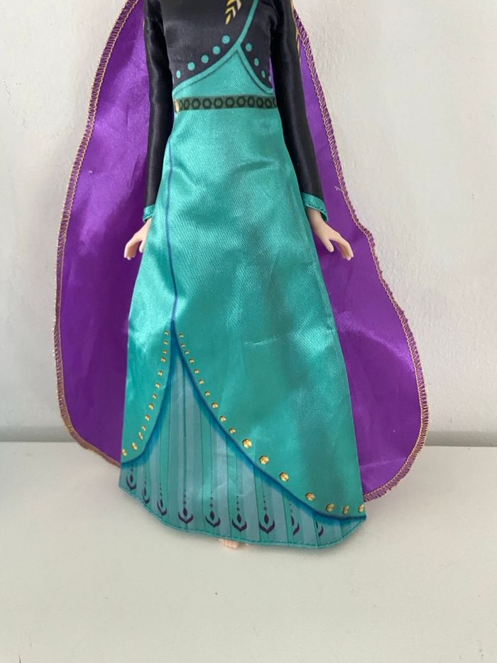 • Anna : tenue de couronnement avec robe vert émeraude satinée, diadème doré et cape violette.