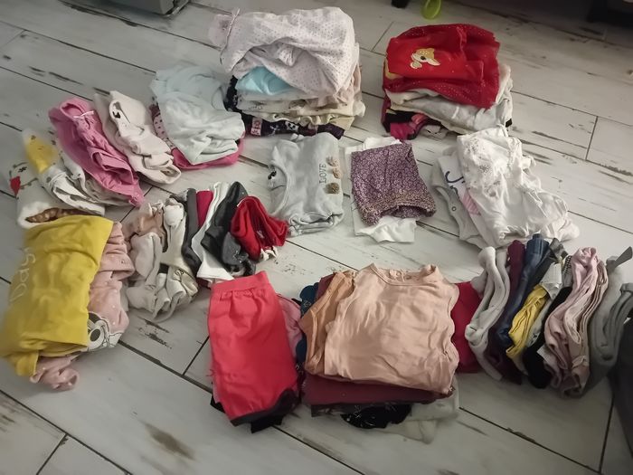 Lot 9 mois bon état 12 Pantalons 10 Collants 7 Manche longue 2 Manche courte 1 Pull 7 Robe dont 1 Manche courte 4 Shorts 11 Bodies 17 Pyjamas 5 Gilets 3 Manteau 2 Combinaisons