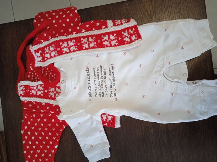1 pyjama gemo " mamounette" 1 gilet rouge et blanc laine 2€