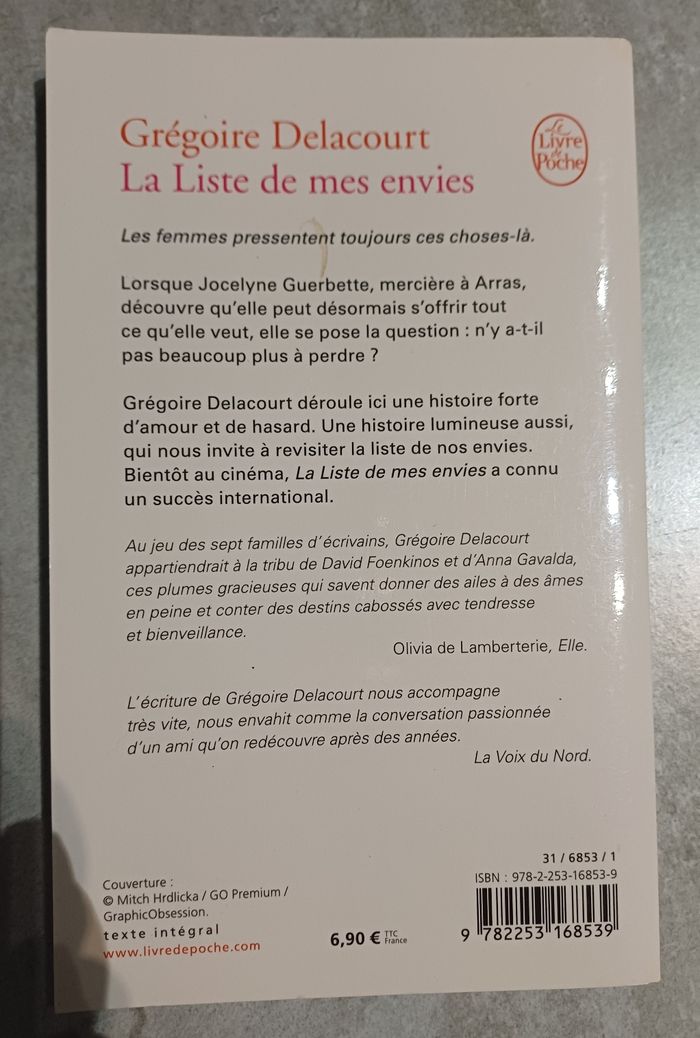 Les femmes pressentent toujours ces choses-là. Lorsque Jocelyne Guerbette, mercière à Arras, découvre qu'elle peut désormais s'offrir tout ce qu'elle veut, elle se pose la question: n'y a-t-il pas beaucoup plus à perdre ? Grégoire Delacourt déroule ici une histoire forte d'amour et de hasard. Une histoire lumineuse aussi, qui nous invite à revisiter la liste de nos envies. Bientôt au cinéma, La Liste de mes envies a connu un succès international. Au jeu des sept familles d'écrivains, Grégoire Delacourt appartiendrait à la tribu de David Foenkinos et d'Anna Gavalda, ces plumes gracieuses qui savent donner des ailes à des âmes en peine et conter des destins cabossés avec tendresse et bienveillance. Olivia de Lamberterie, Elle.L'écriture de Grégoire Delacourt nous accompagne très vite, nous envahit comme la conversation passionnée d'un ami qu'on redécouvre après des années. La Voix du Nord.