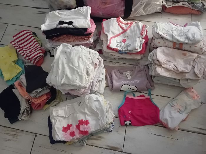 Lot 6 mois bon état 12 Pantalon 21 Manche longue 15 Manche courte 1 Pull 6 Robe dont 1 Manche longue 5 Short 3 Pantacourt 18 Bodie Manche courte 21 Bodie Manche longue 11 Pyjama 6 Gilets 3 Combi short 2 Maillot
