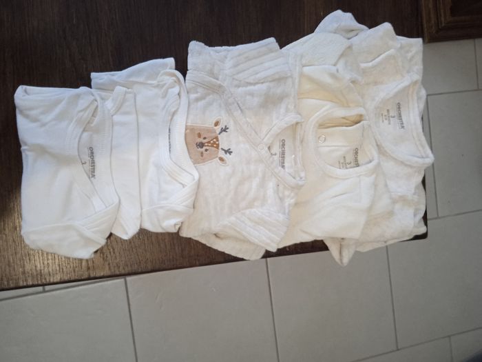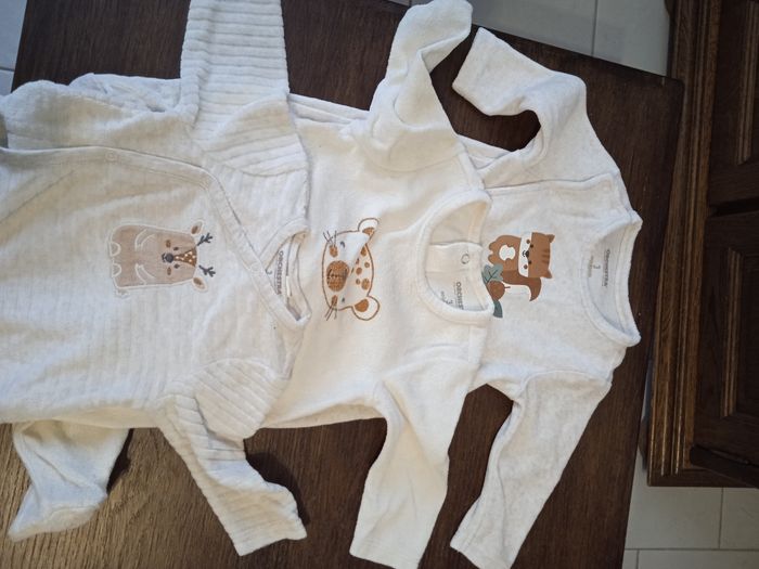 Lot de vêtements 3mois 3 pyjamas éponge beige dessin marron 2 body longues manches Orchestra Très bon état 5€