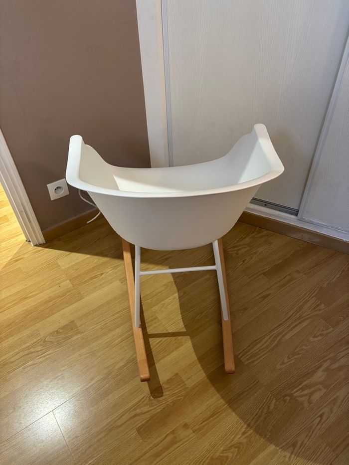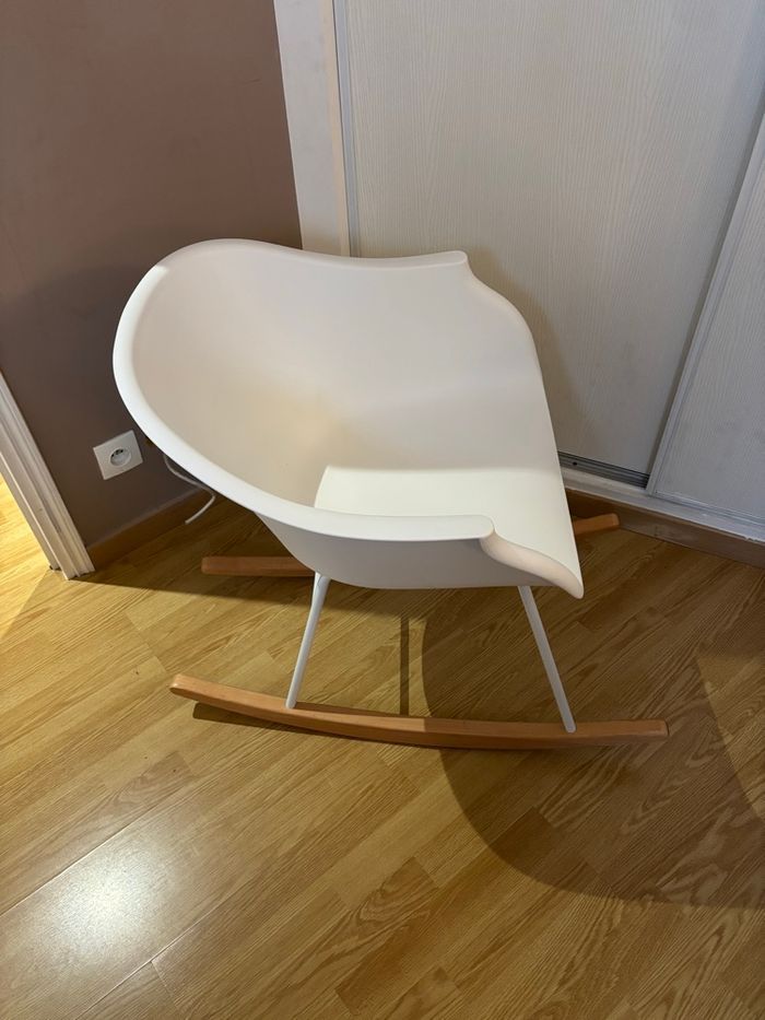 Très jolie chaise à bascule au design moderne. Assise confortable en plastique blanc, structure stable avec pieds en métal et patins en bois. #chaise #chaiseàbascule #blanc #bois #chair #rockingchair #white #wood #sedia #sediaadondolo #bianco #legno #cadeira #cadeiradebalanço #branca #madeira #silla #mecedora #blanca #madera #stoel #schommelstoel #wit #hout