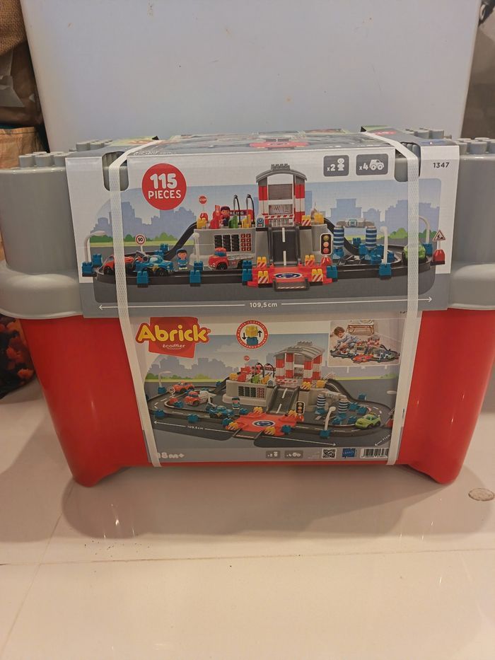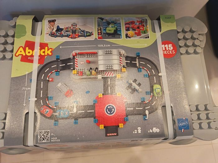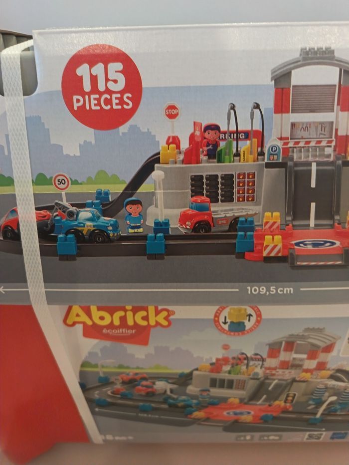 Coffret de jeu Abrick "Garage et Circuit" (Modèle 1347). Neuf sous plastique, boîte scellée. Contient 115 pièces dont 4 véhicules et 2 personnages. Circuit complet facile à assembler. Fabrication française, dès 18 mois. Envoi rapide.
