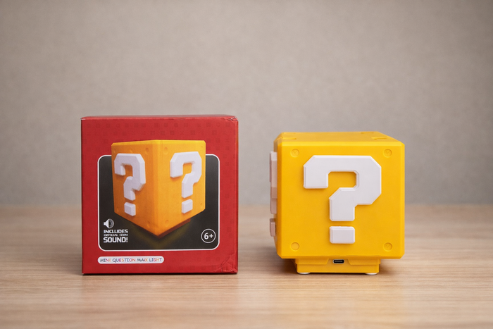 Lampe décorative Mini Question Block Super Mario, inspirée de l’emblématique bloc “?” du célèbre jeu vidéo. C’est une veilleuse compacte qui apporte une ambiance gaming et rétro dans une chambre, un bureau ou une salle de jeux.
