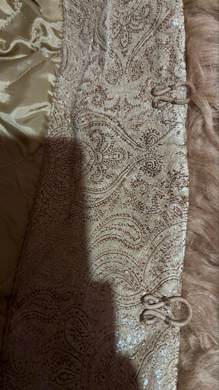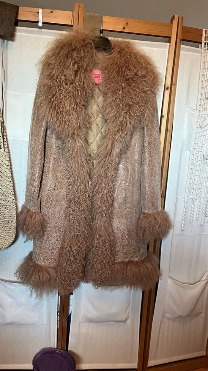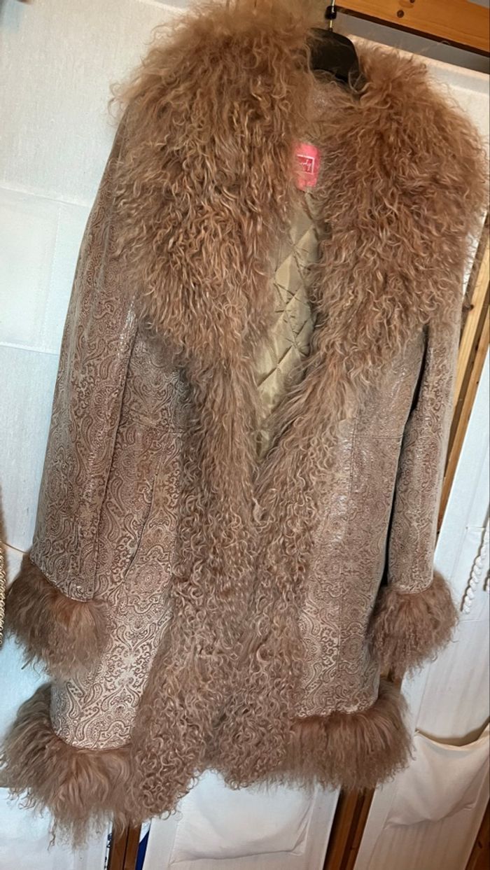Je vends cette veste psychédélique années 70, tendance en cuir marron clair motifs bohème, laine d’agneau de Mongolie et cuir motifs paillet boteh cachemire En très bon état taille plutôt comme un 38 ou 40 Mesures : -Épaule à épaule 42 cm -Aisselles à aisselles 52 cm -Longueur 98 cm fourrure comprise Bras 65 cm fourrure comprise -ferme avec 4 accroches, 3 grandes poches Pièce Vintage Magnifique 🤩 Envoi rapide