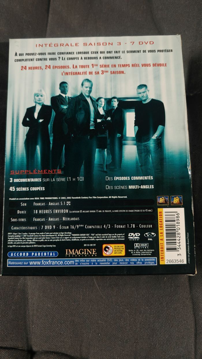 L'intégrale de la saison 3 de la série 24H Chrono 24 épisodes - 7 DVD dont des scènes coupés, des documentaires, des épisodes commentés, etc. en VF, VO ou Sous titres Envoi rapide par Mondial Relay Envoi autres transporteurs possible mais dépôt plus long.