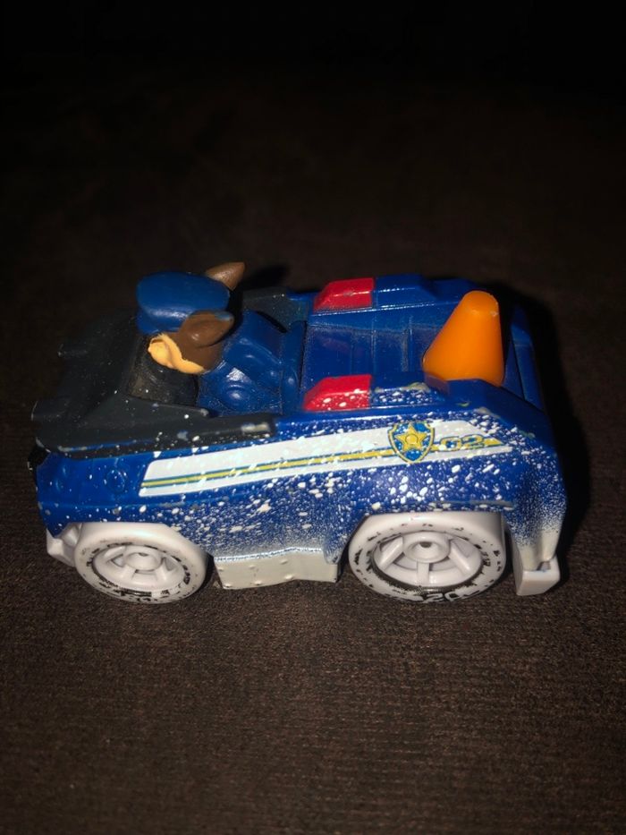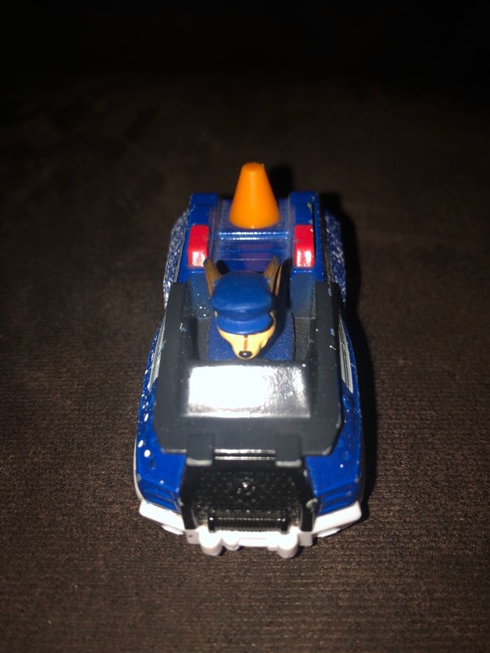 Véhicule Chase collection snow. Le chien ne peut s’enlever de la voiture.