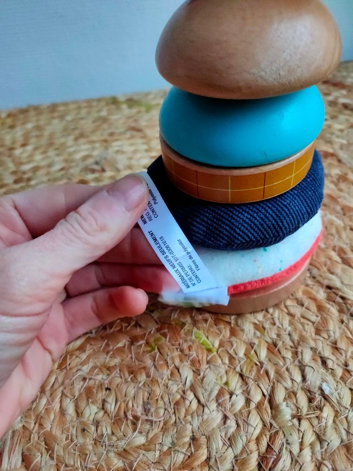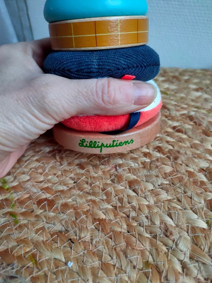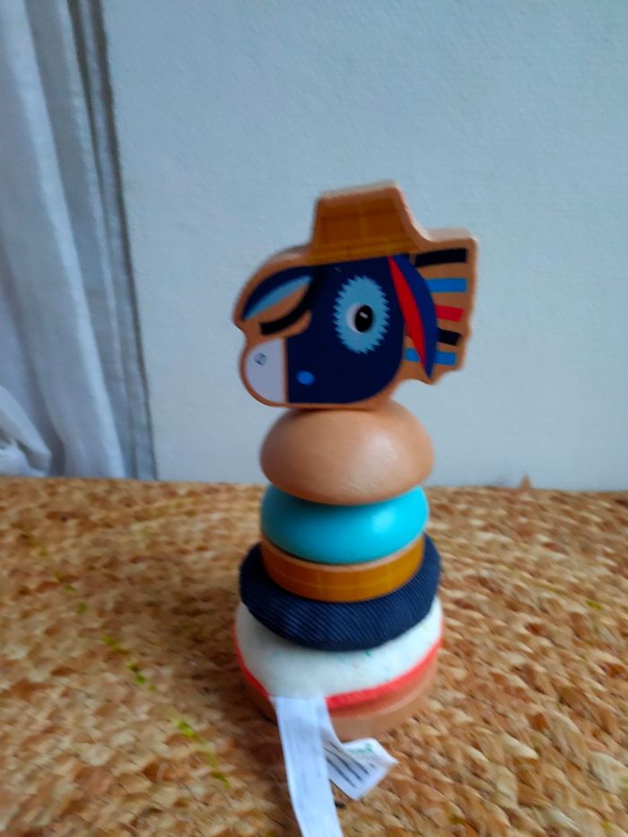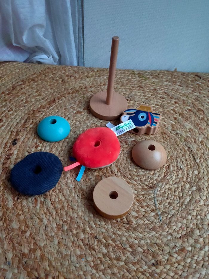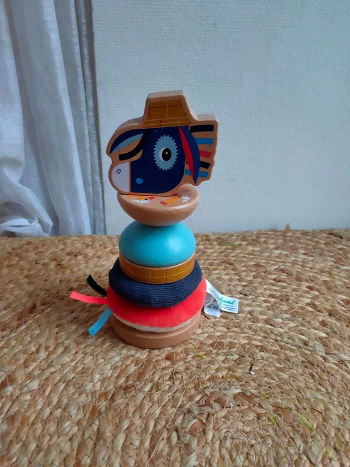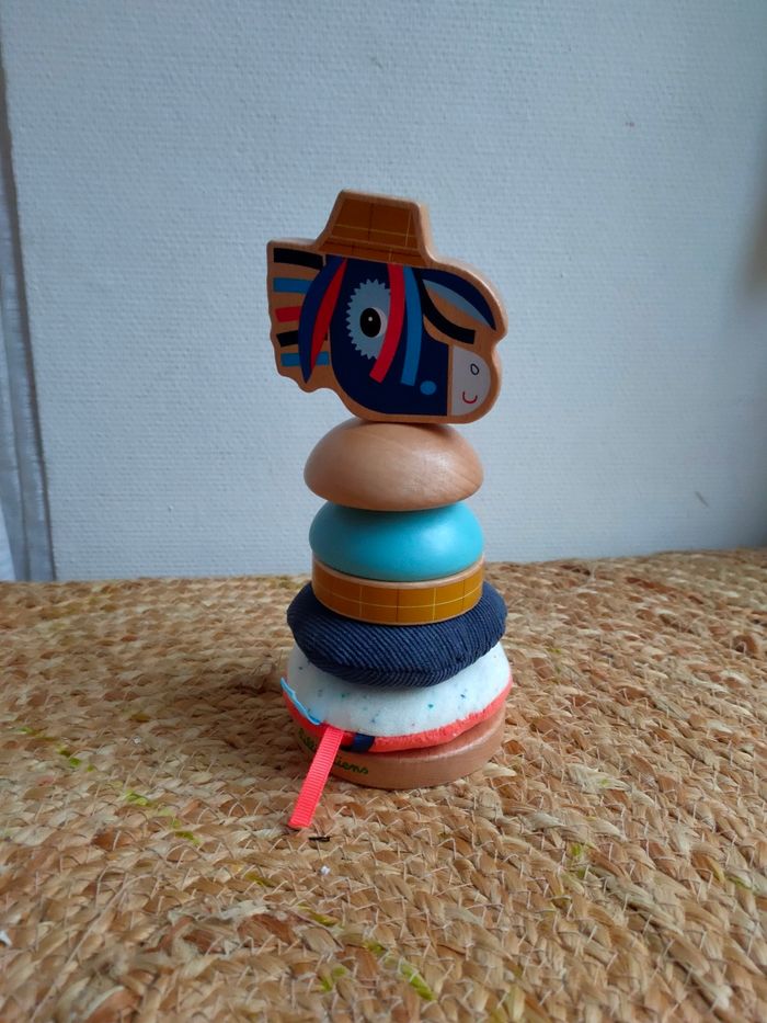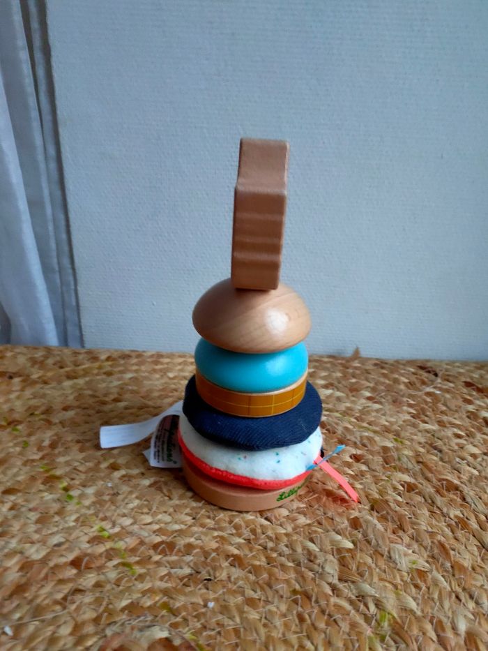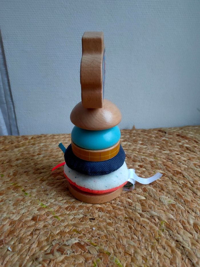 Jolie tour/pyramide à empiler pour développer la motricité fine. Empilez les pièces de différents matériaux et de différentes couleurs de manière créative. La variété de formes, de couleur et de matériel stimulent les sens. (Lavable en machine). Avec des éléments en bois et en tissu de formes et couleurs différentes (bois certifié et peinture à l'eau). Il est en très bon état.