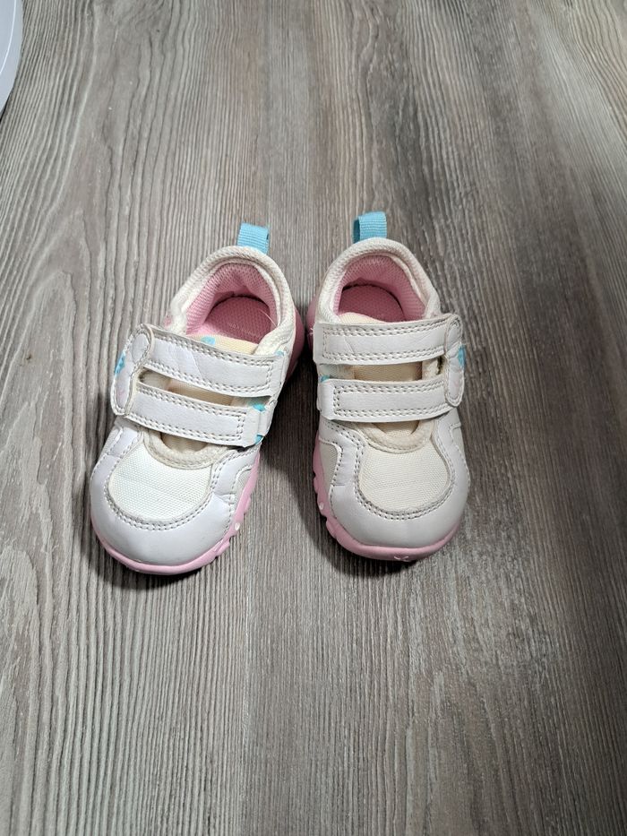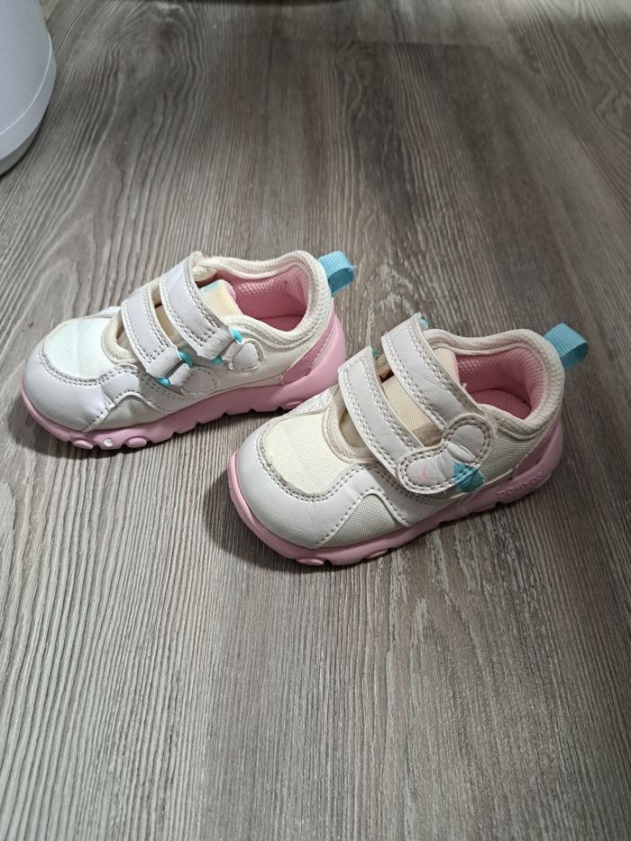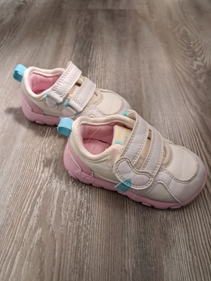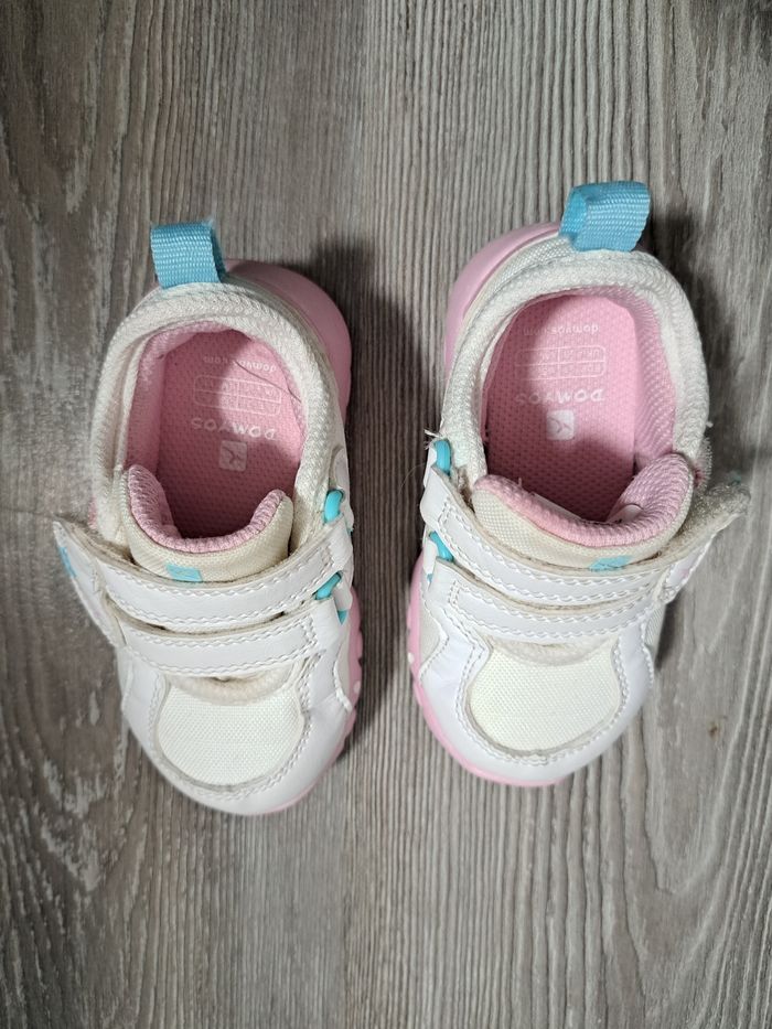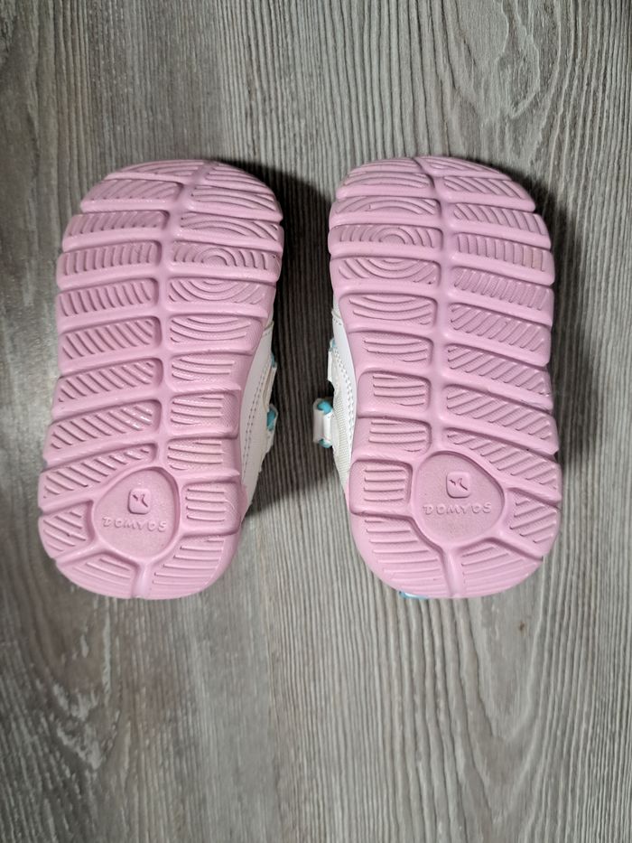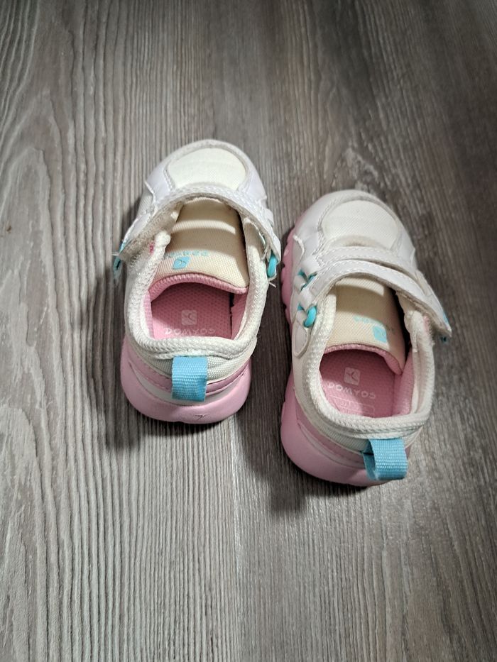 paire de chaussures de sport/baskets marque : DOMYOS (Décathlon) pointure : 21 colori : blanc, rose et turquoise fermeture à scratch Peu portées Baskets poids plume