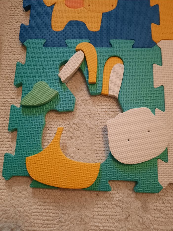 Lot de 2 ensembles Tapis de jeu en mousse avec puzzle ludi. 2x 9 dalles pour une grandeur d'environ 90/180cm (si positionné en rectangle). Super pour les premiers déplacements de bébé mais aussi pour le jeu au sol des plus grands. Le puzzle est super aussi pour travailler réflexion et motricité fine. Encore en très bon état (seul quelques petites traces de griffures)