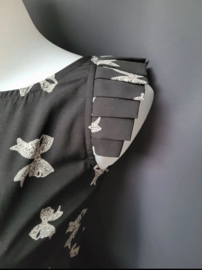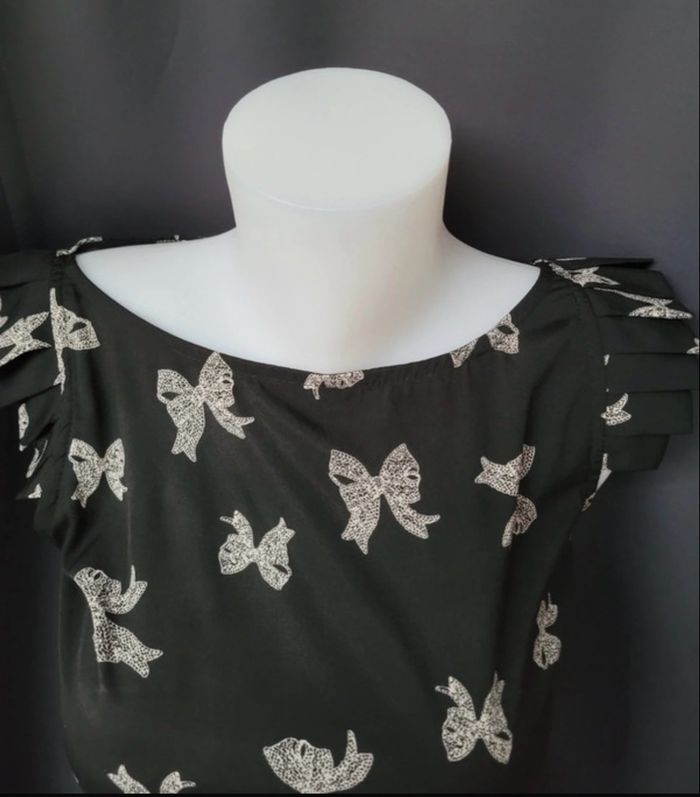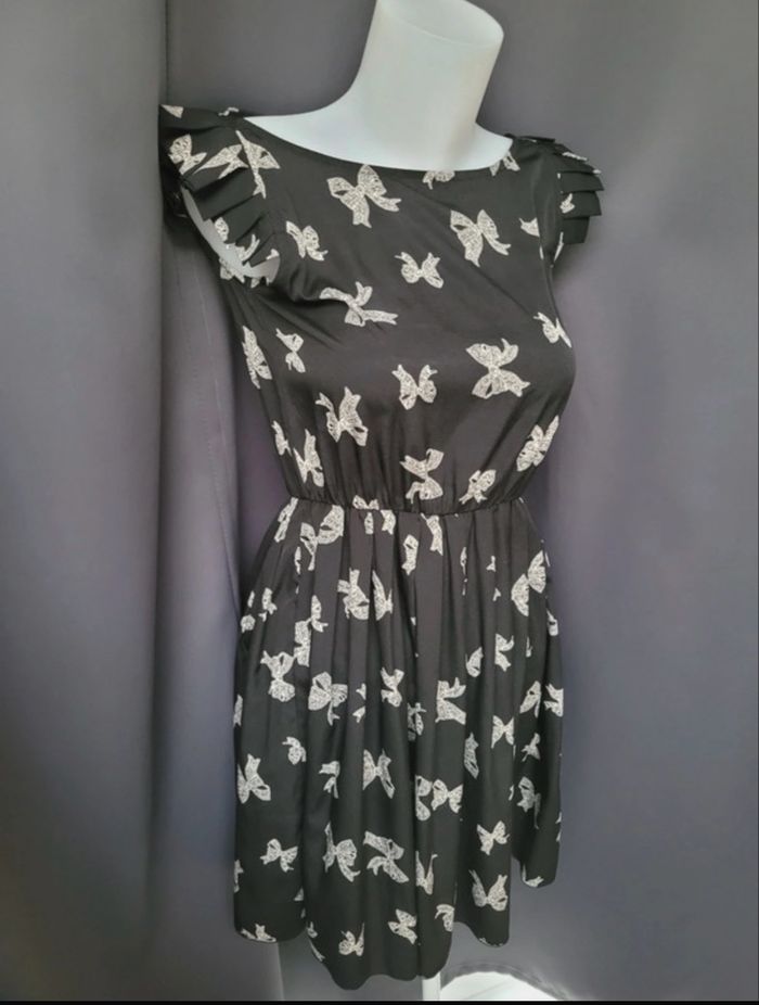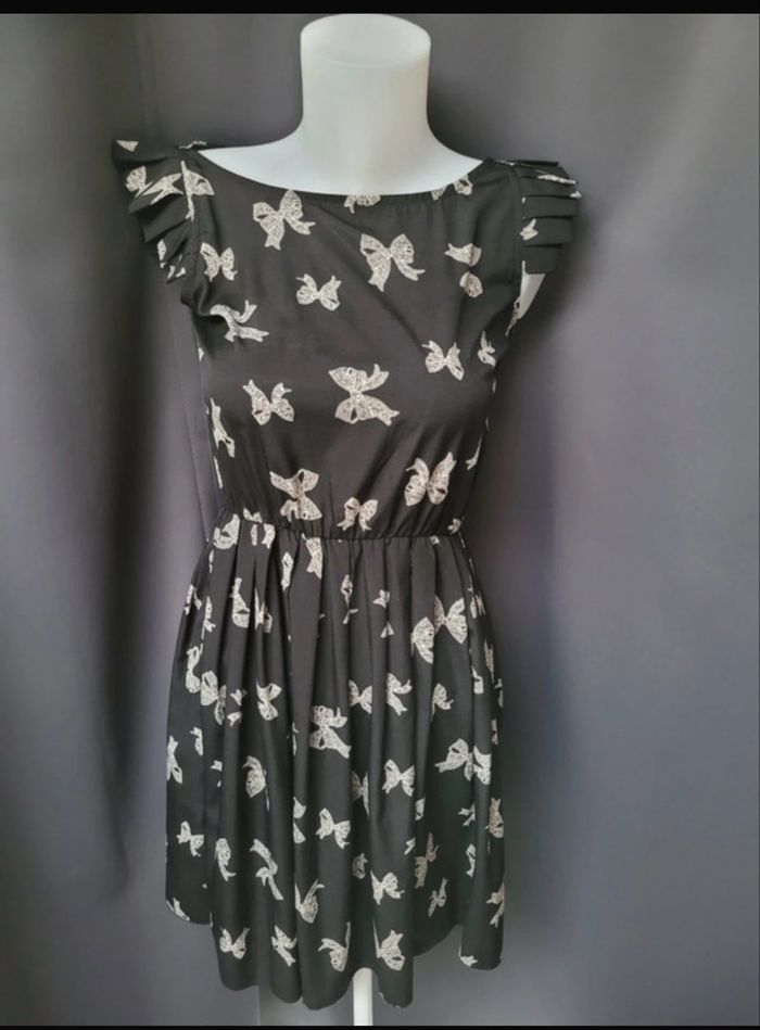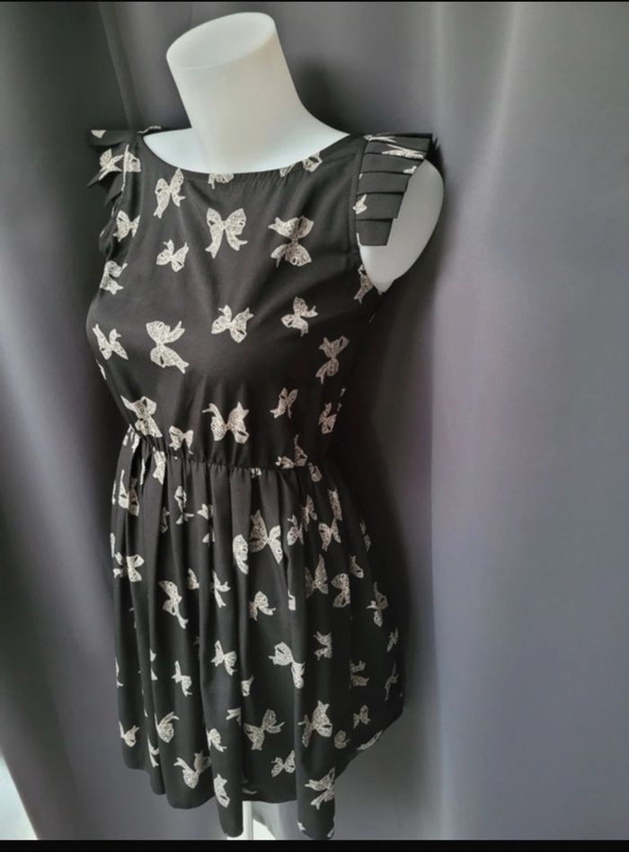 Robe New look taille s/m Très bon.etat Couleur noir et blanc Motif noeud Decoupe au niveau des manches Serrée à la taille