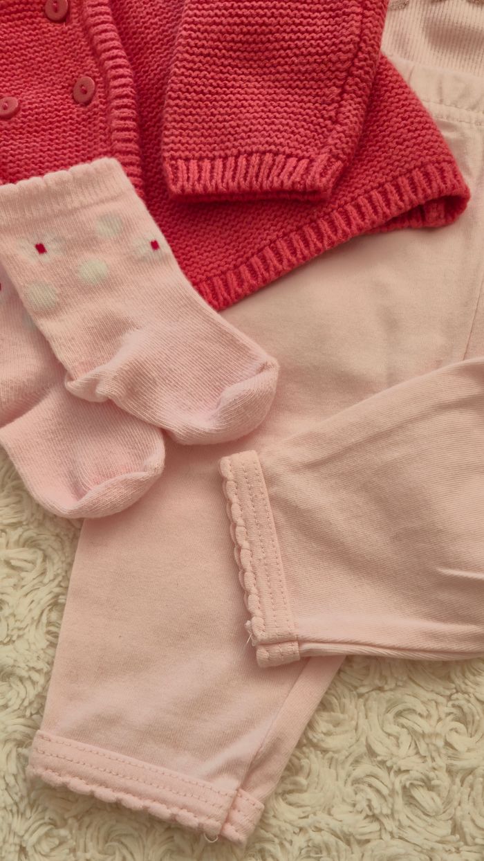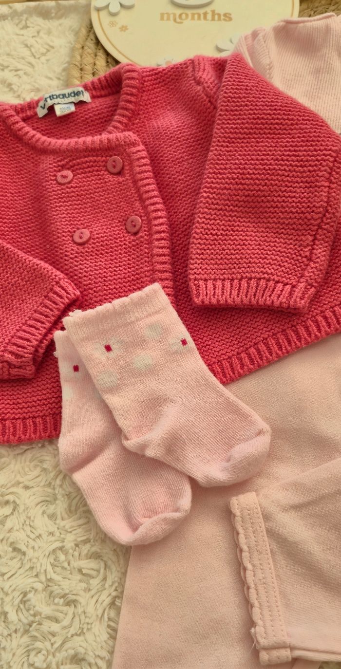 Ensemble legging rose, Tee-shirt manches longues rose inscription pailletée, gilet fuchsia et chaussettes assorties.