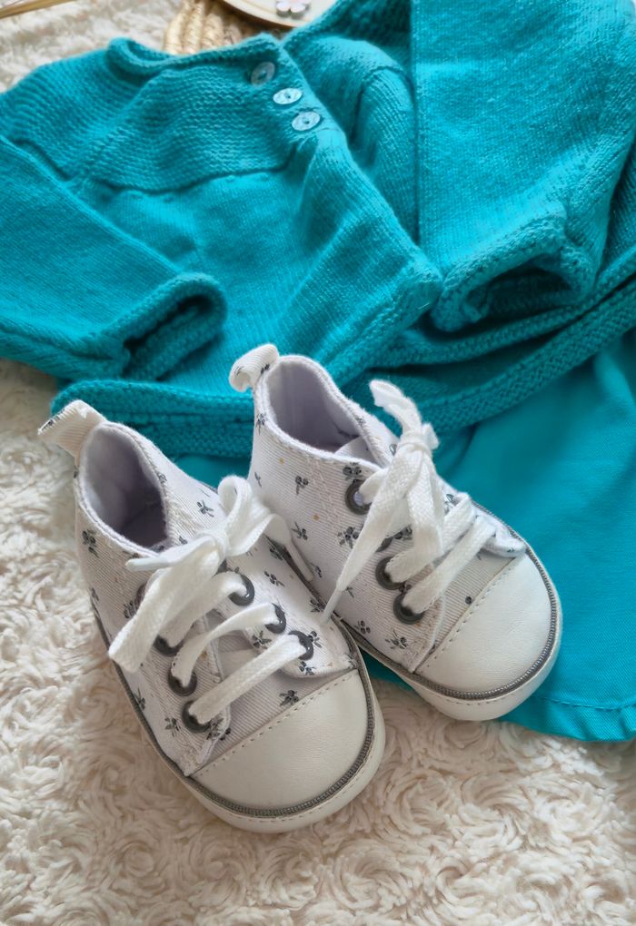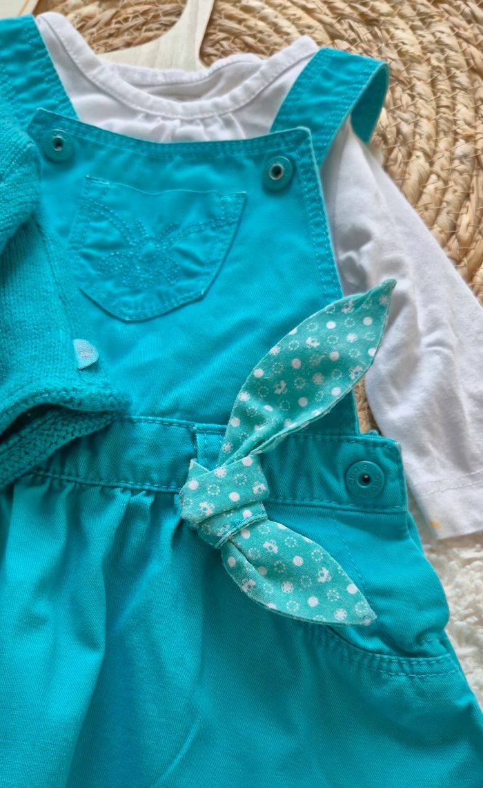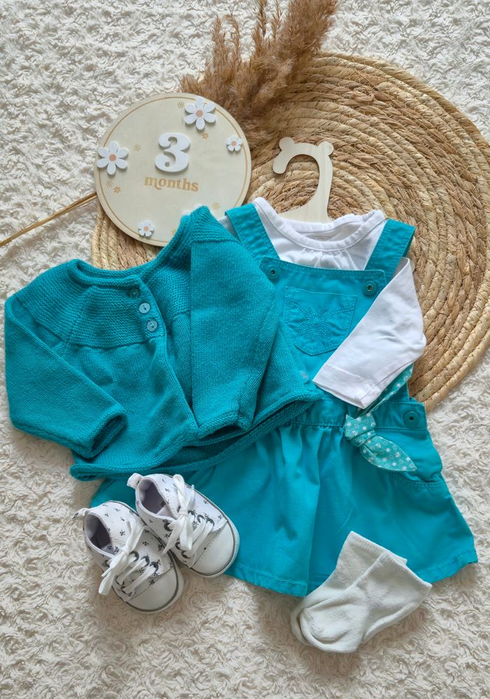 Ensemble robe salopette turquoise, Tee-shirt manches longues blanc a motif, gilet assorti turquoise et pour finir la tenue une paire de baskets fleurie et chaussettes blanche.
