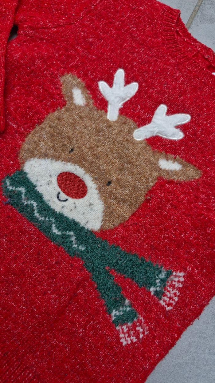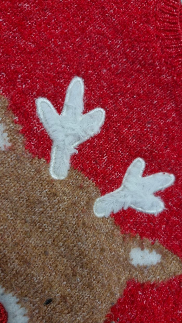 Motif renne avec bois en relief, tout doux. Coloris rouge, vert et blanc.