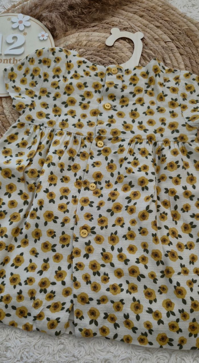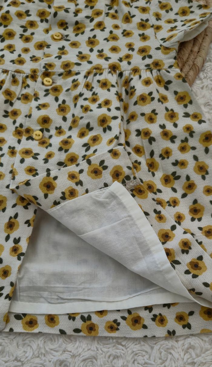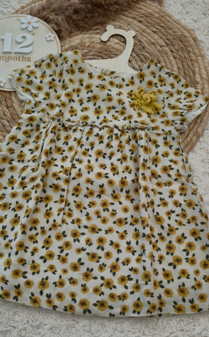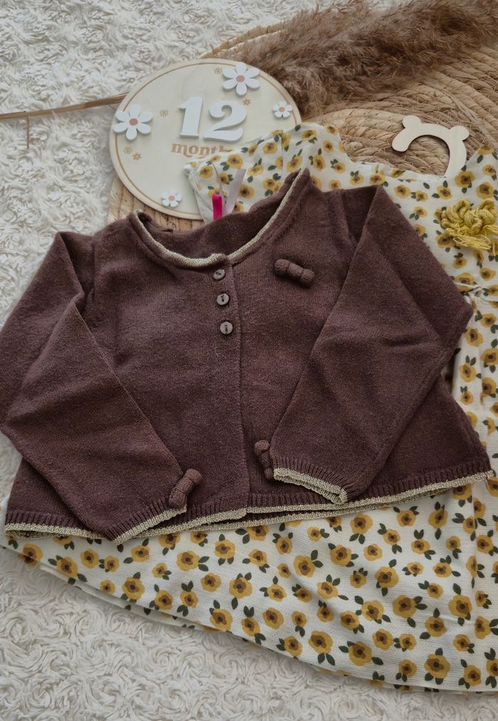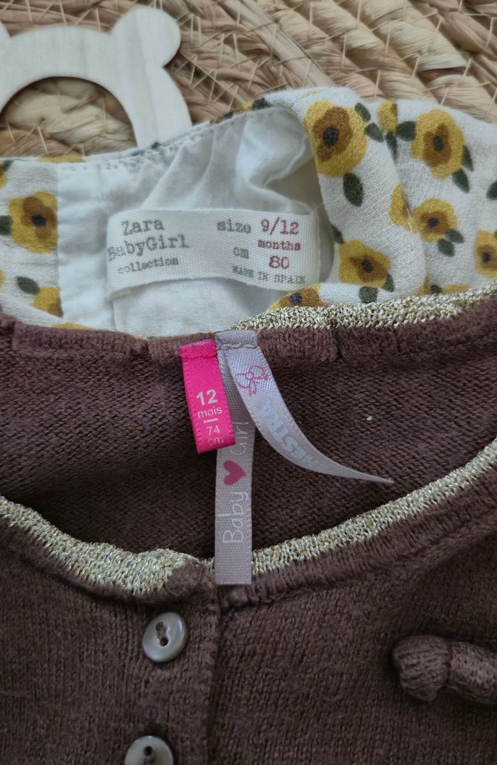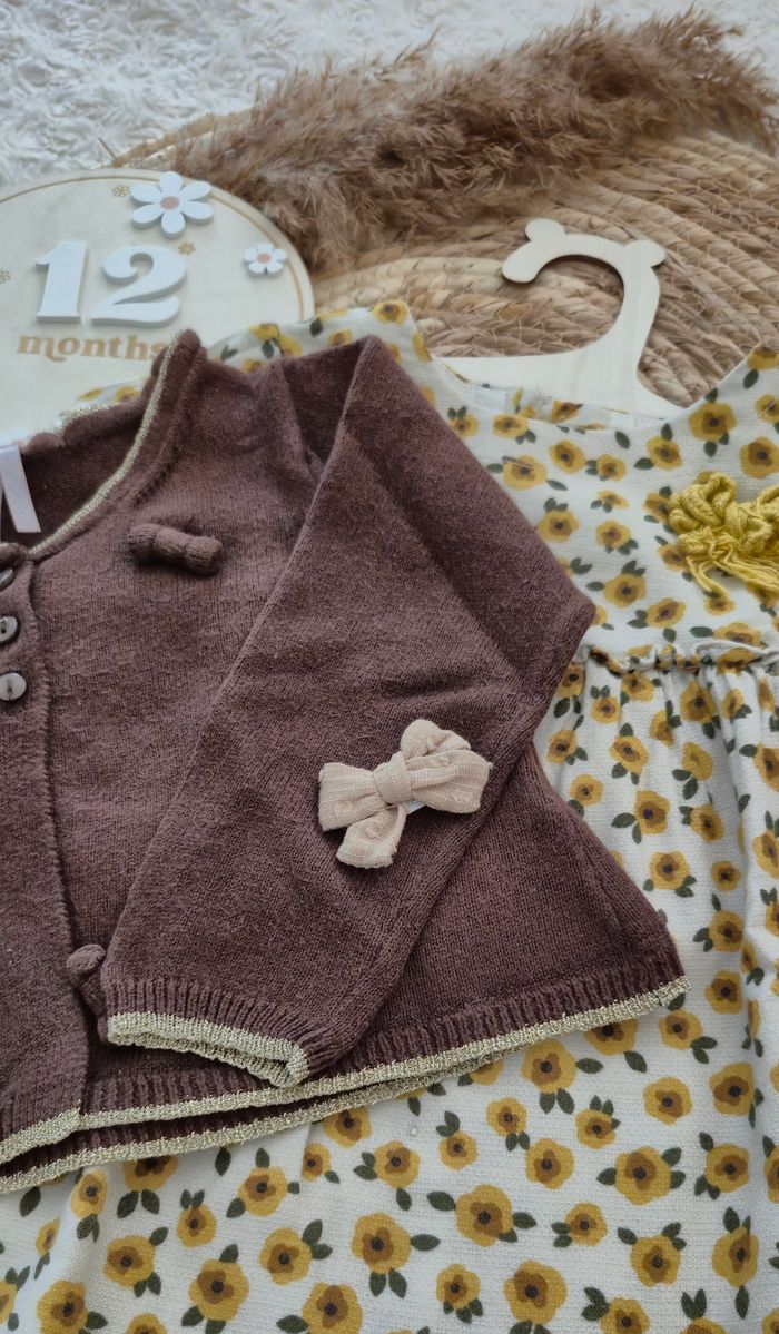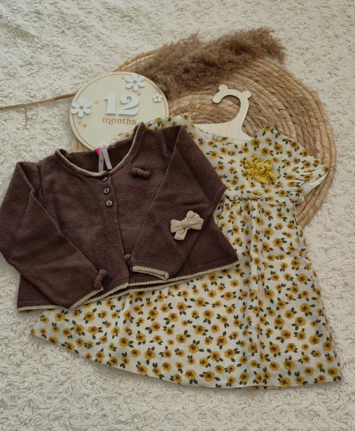 Ensemble robe zara doublée tons moutarde, gilet marron et barrette assortie.