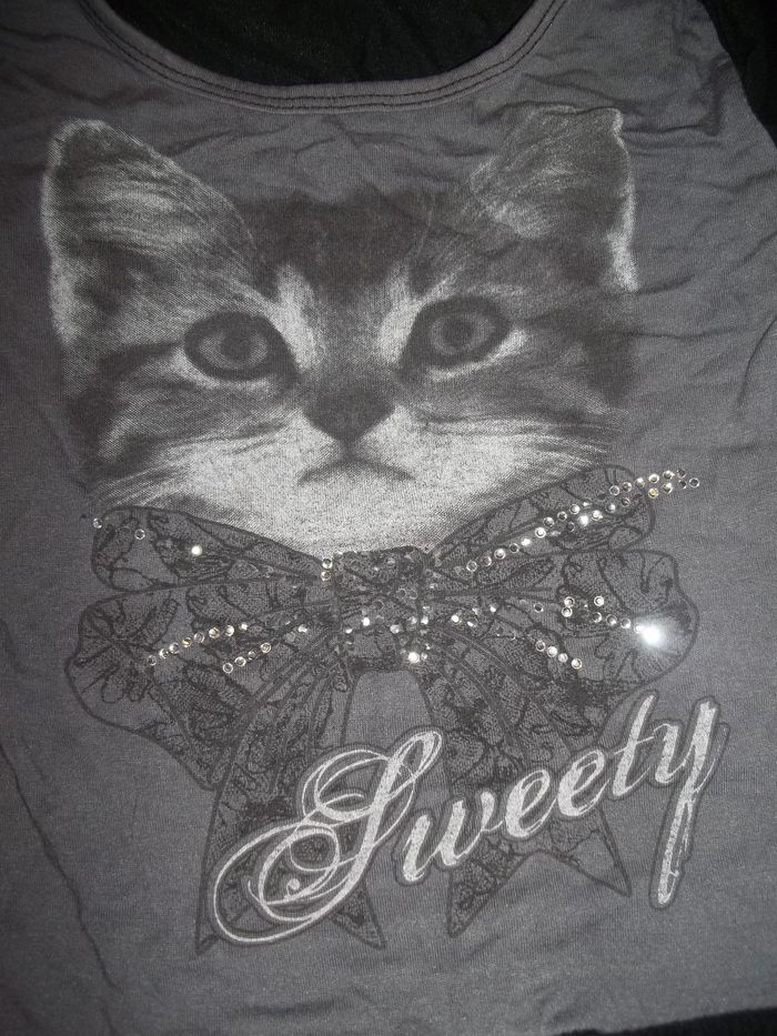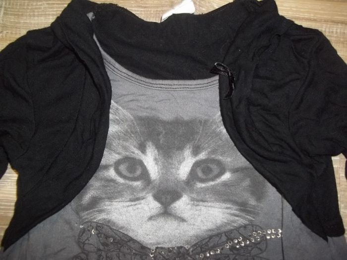 Tunique (ou robe courte) à manches 3/4, fluide (95 % viscose 5 % élasthanne) effet 2 en 1 avec "faux boléro" noir col châle avec petit noeud sur côté gauche, haut gris avec impression phot chaton et quelques strass sur gros noeud papillon (en manquent) "Sweety", jupette noire effet boule. Longueur 49 cm, manches 31 cm, largeur aisselles 31 cm. Noté 8 ans mais convient plus jeune.