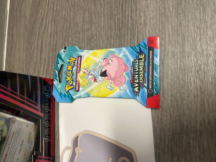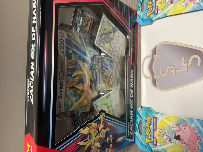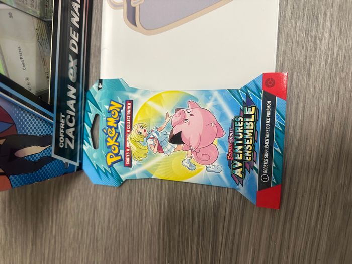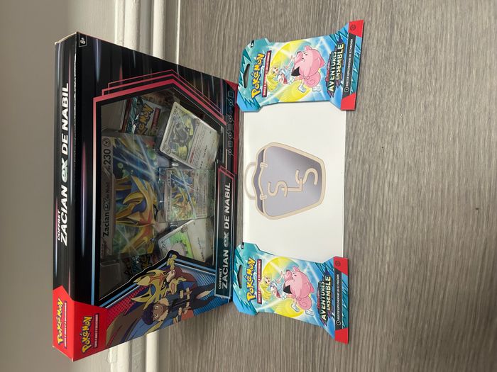 Lot Pokémon comprenant, 1 coffret Zacian-ex de Nabil et 2 boosters EV09 Aventures ensemble en français.