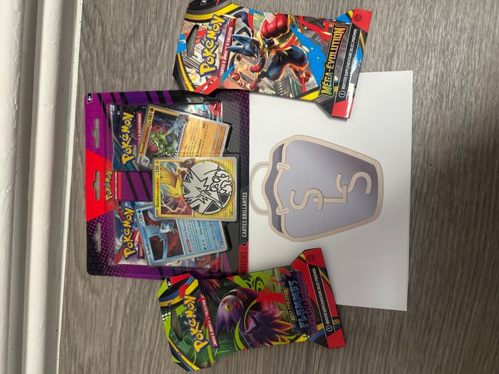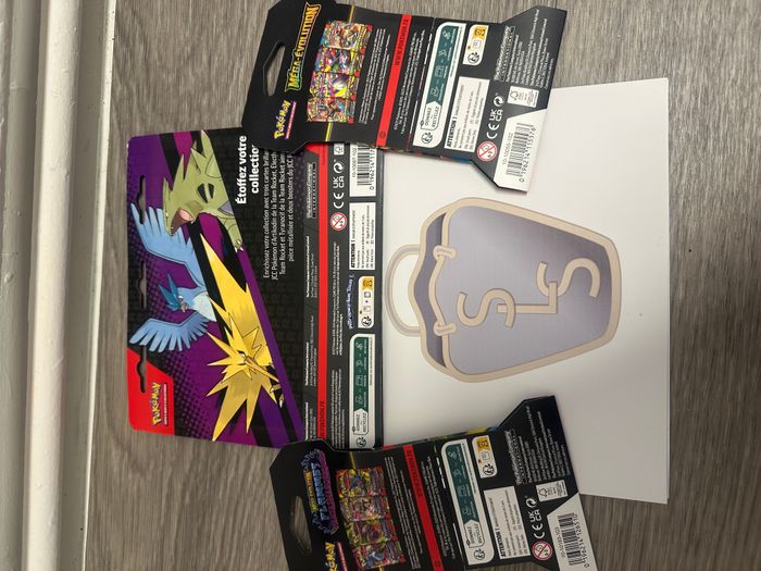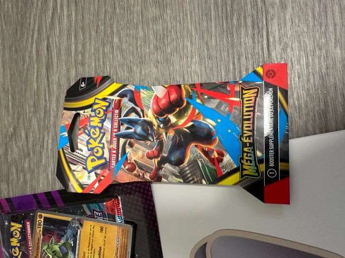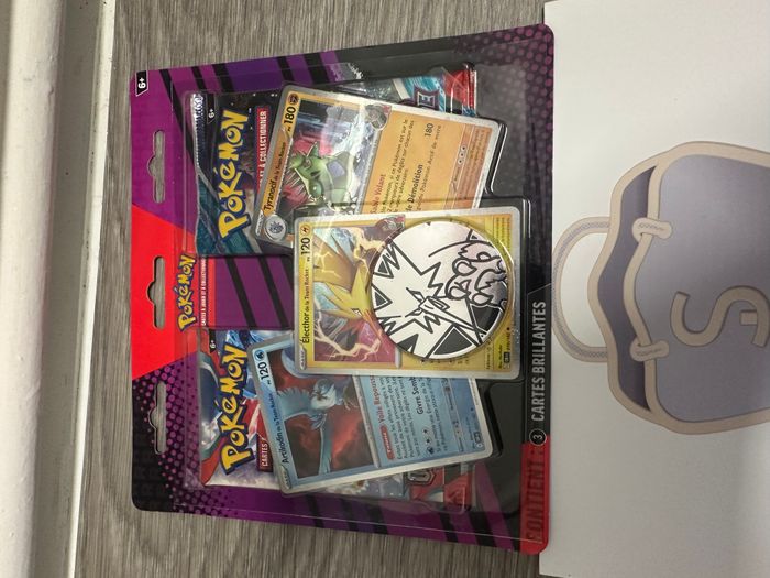 Lot Pokémon comprenant, 1 Duopack Electhor + 1 booster ME01 Méga-évolution et 1 booster ME02 Flamme fantasmagorique en français.