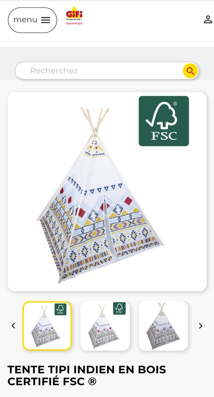Tente Tipi blanche aux motifs indiens avec structure en bois certifié FSC ®.