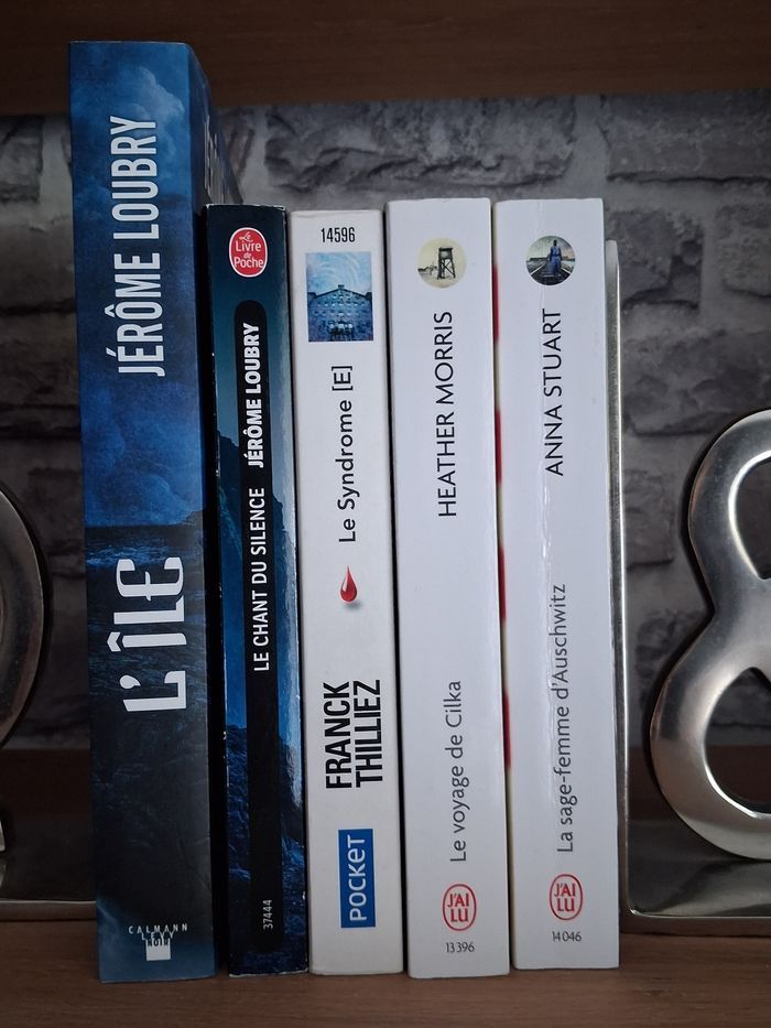 ✏️ L’île Jérôme Loubry Edition Calmann Levy Très bon état ✏️ Le chant du silence Jérôme Loubry Edition Le livre de poche Très bon état ✏️ Le voyage de Cilka Heather Morris Edition J’ai Lu Bon état La sage-femme d’Auschwitz (Vendu) Le syndrome E (vendu) Il s’agit de livres d’occasion, ils présentent donc des traces d’utilisation.