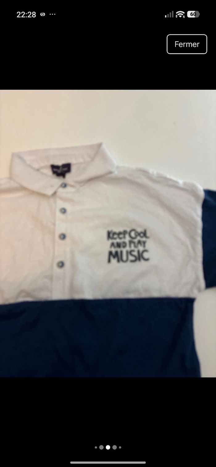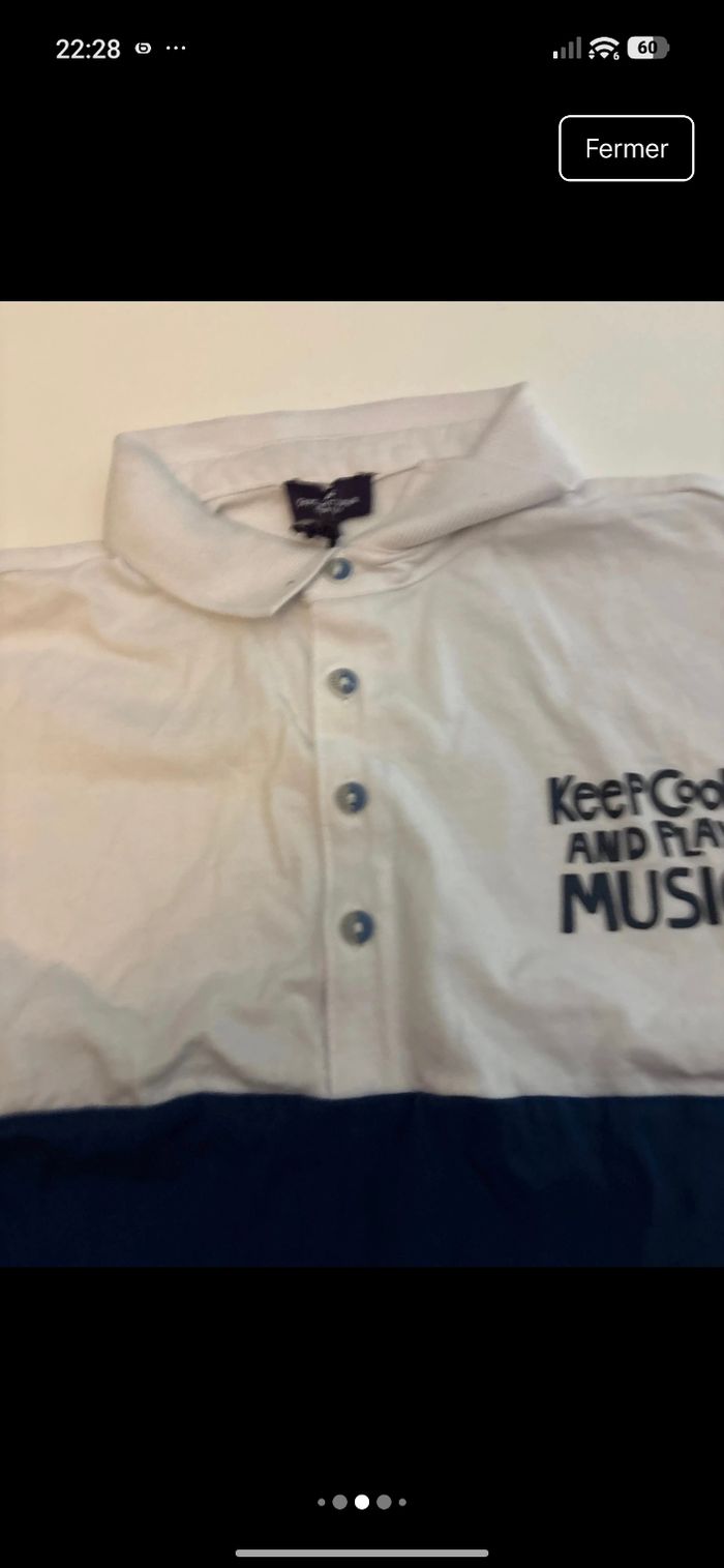 Détails : Col polo classique avec patte de boutonnage à quatre boutons, broderie "Keep Cool and Play Music" sur la poitrine, motif graphique original en bas à gauche, manches courtes, coupe droite confortable.