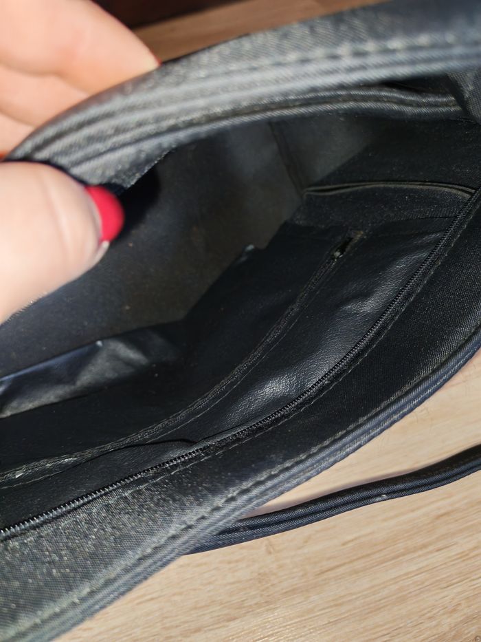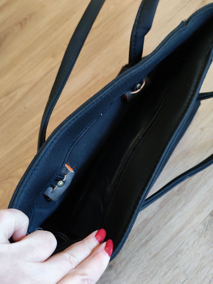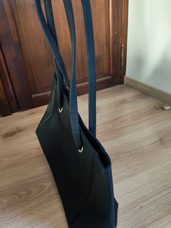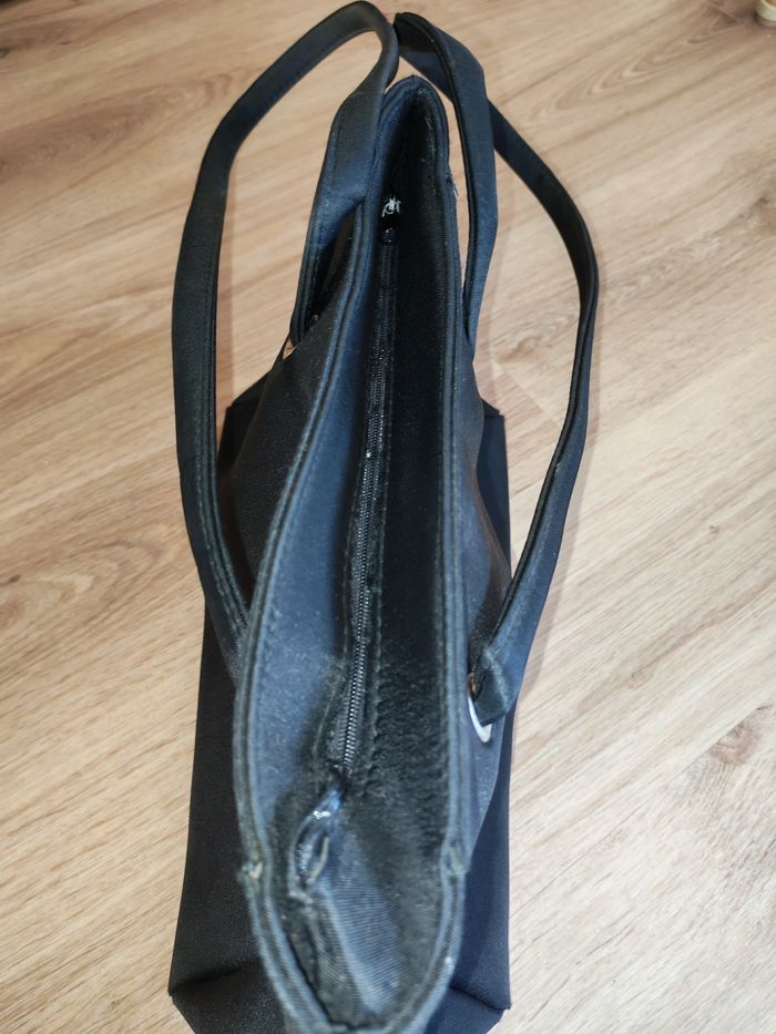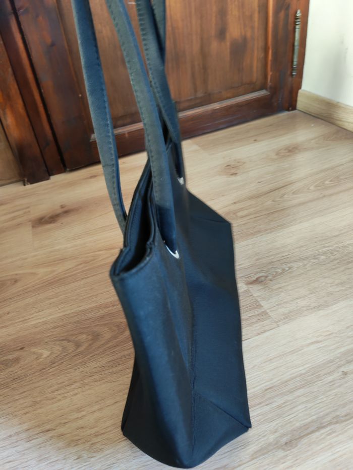 Sac à main noir en polyester ou nylon, fourre-tout. Sac avec deux anses, à mettre sur l'épaule, se ferme par femeture éclaire et a une poche à zip à l'intérieur, le sac est en très bon état général, sans doublure à l'intérieur (c'est le modèle qui est comme ça), comporte une pliure qui e marque.