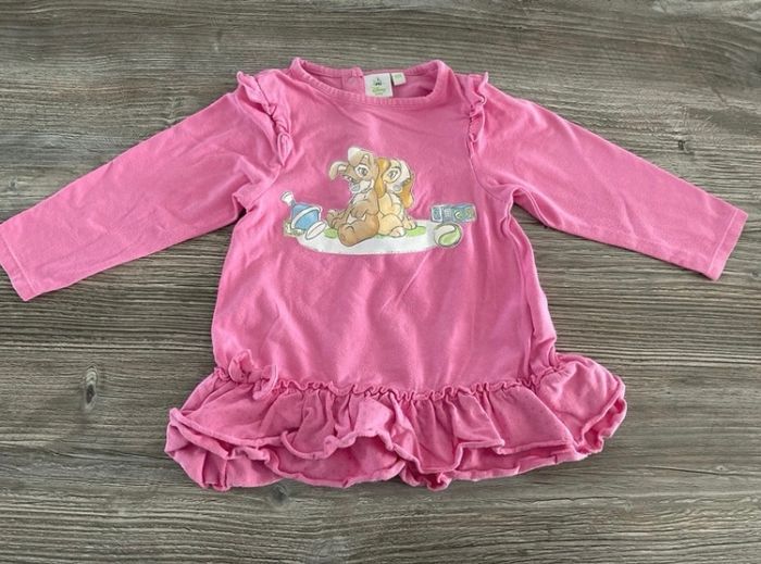 Motif la belle et le clochard, volants sur les épaules et en bas du t-shirt, 3 boutons pressions dans le haut du dos.