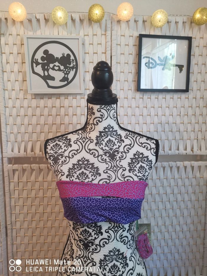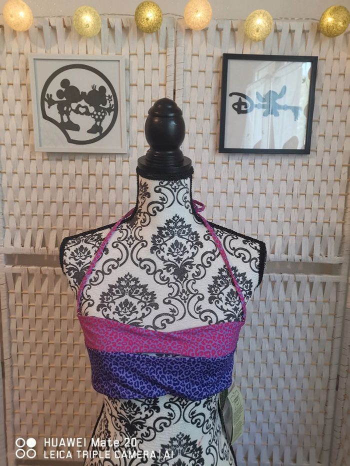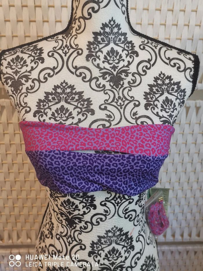 💕Sublime haut de maillot de bain bandeau sans armatures de la marque United Colors of Benetton, neuf avec étiquette. Il présente un motif léopard tendance en rose vif et violet. Le haut est un bandeau avec des liens amovibles à nouer autour du cou, dans le dos pour un ajustement parfait et confortable.