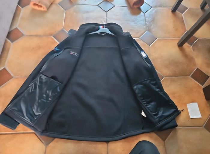Attention il est noté que la veste est de taille M mais mon mari ne met que du XL l'extérieur est en polyester et l'intérieur style polaire
