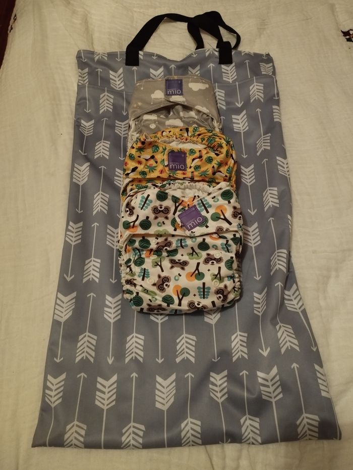 Je vends couches lavables Bambino Mio – Taille 2 (adaptées à partir d’environ 9 kg et +).