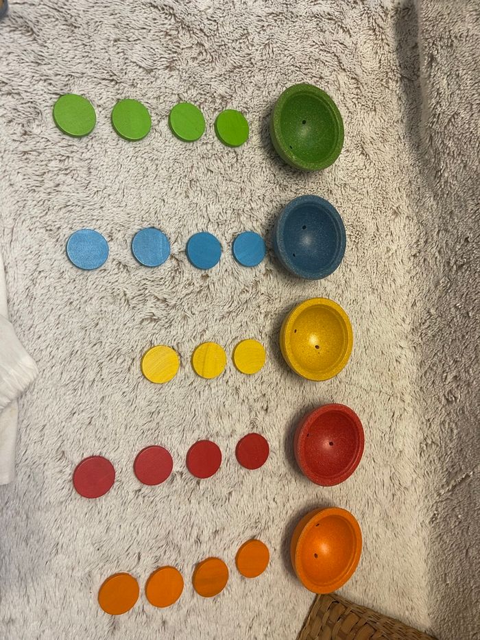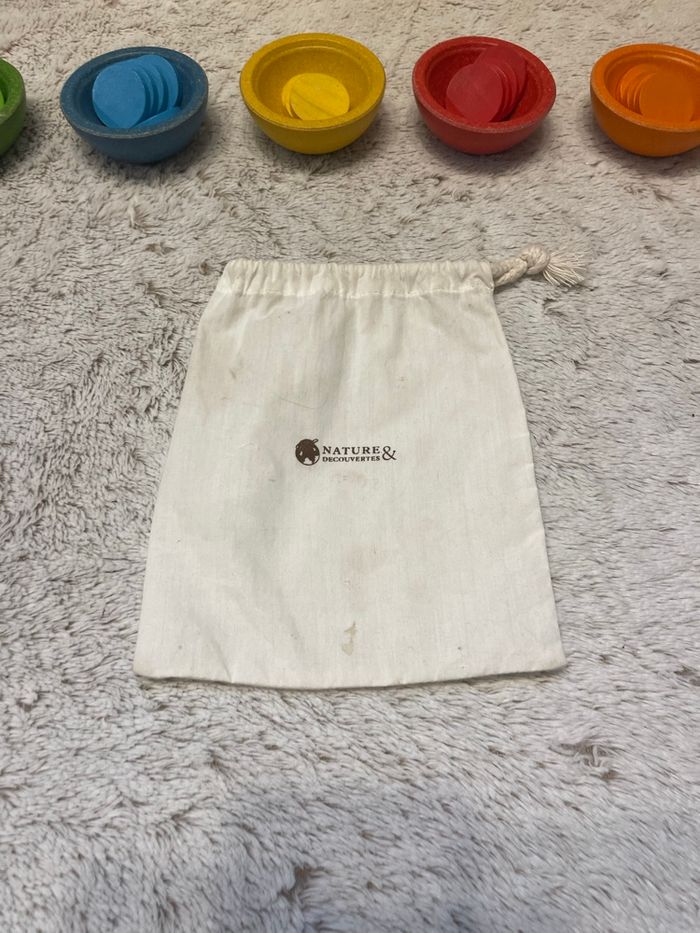 Le jeu est composé de 5 coupelles de couleurs arc-en-ciel, 5 jetons de chaque couleur et un sac de rangement en coton.