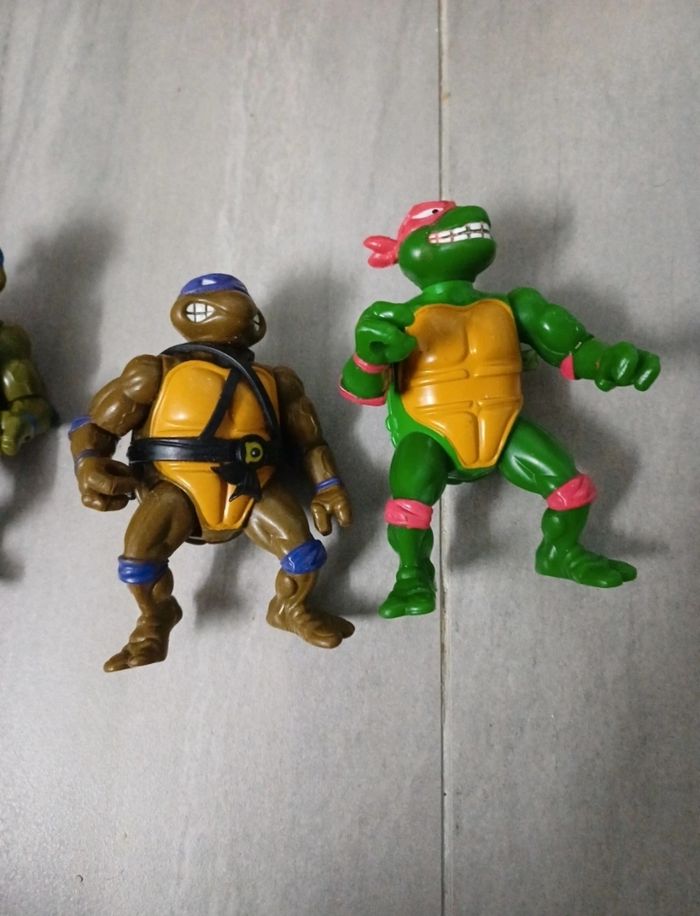 figurines vintage 1989 Bon état il manque quelques accessoires sur le véhicule(rétros, le haut de la porte) avec les 4 tortues bon état il manque les armes des 3, traces de rouge sur les dents de Raphaël, N'hésitez pas à me contacter pour plus de renseignements et à regarder mon dressing pour faire un lot