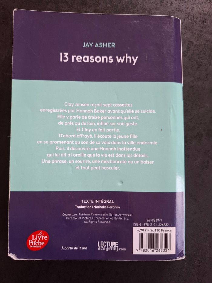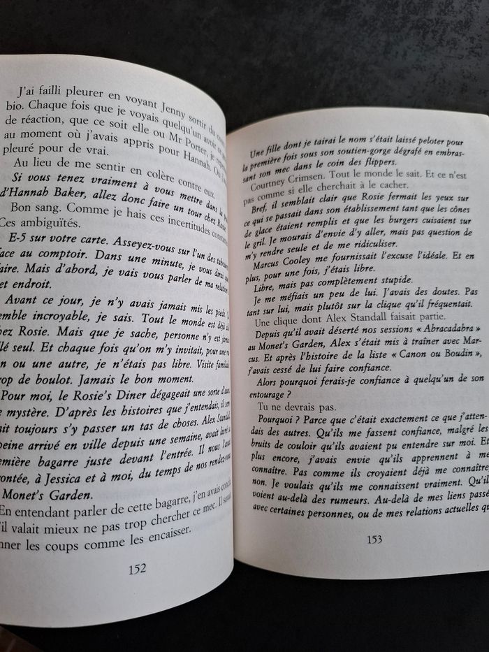 Pourtant, son nom figure sur ces enregistrements. Il est l'une des raisons, l'un des treize responsables de sa mort. D'abord choqué, Clay écoute les cassettes en cheminant dans la ville. Puis, il se laisse porter par la voix d'Hannah. Hannah en colère, Hannah heureuse, Hannah blessée et peut-être amoureuse de lui. C'est une jeune fille plus vivante que jamais que découvre Clay. Une fille qui lui dit à l'oreille que la vie est dans les détails. Une phrase, un sourire, une méchanceté ou un baiser et tout peut basculer...