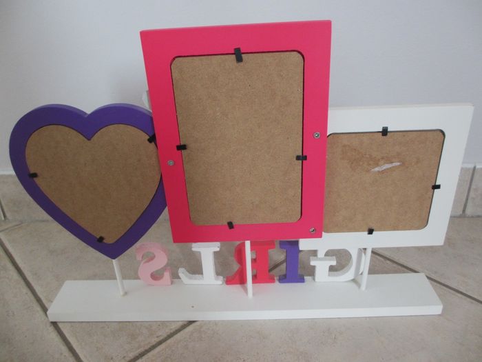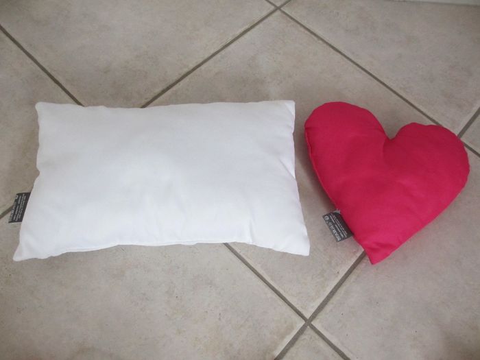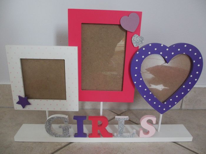 Dimensions ensemble cadres photos : 40 x 28 cm, coussin rectangulaire : 30 x 18 cm, cœur : 21 x 21 cm.