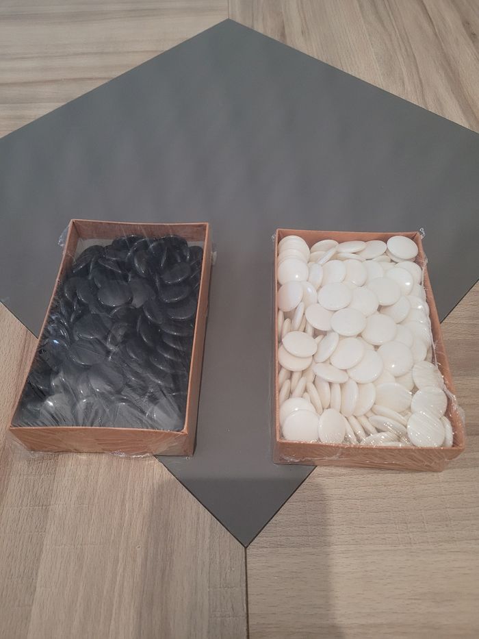 Pierres : Set complet de jetons noires et blanches, conservées dans leurs emballages d'origine.