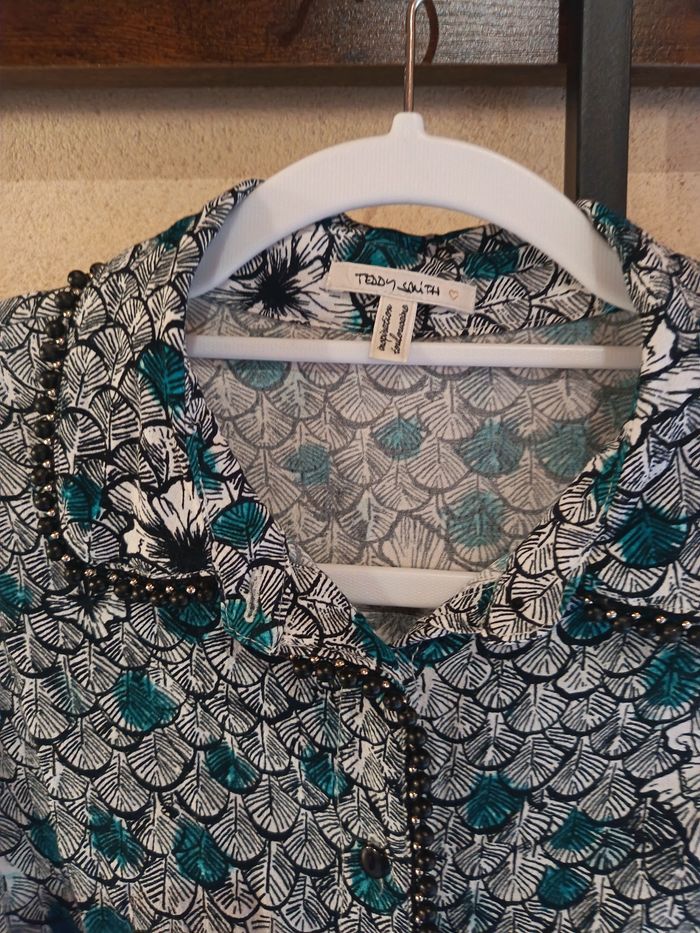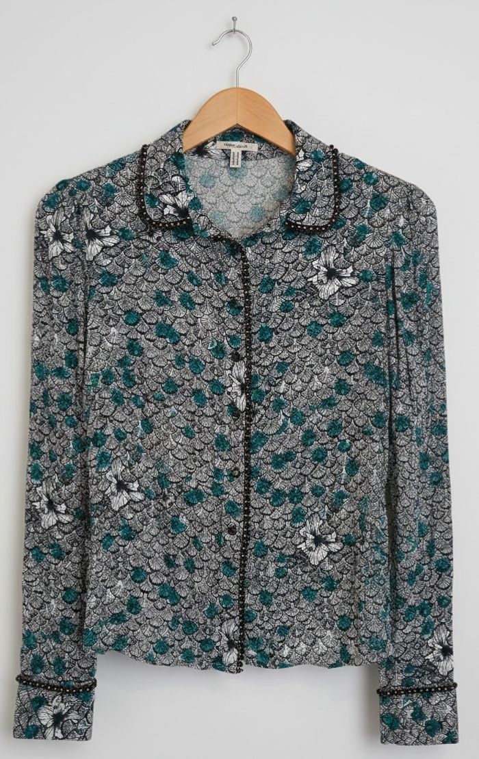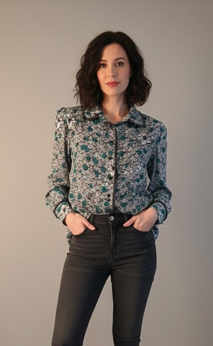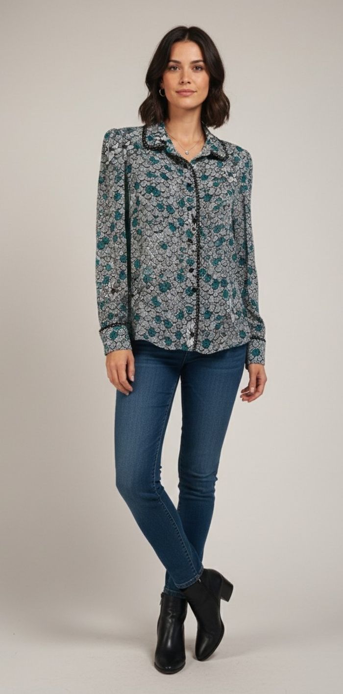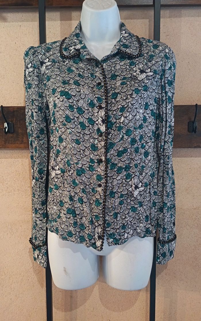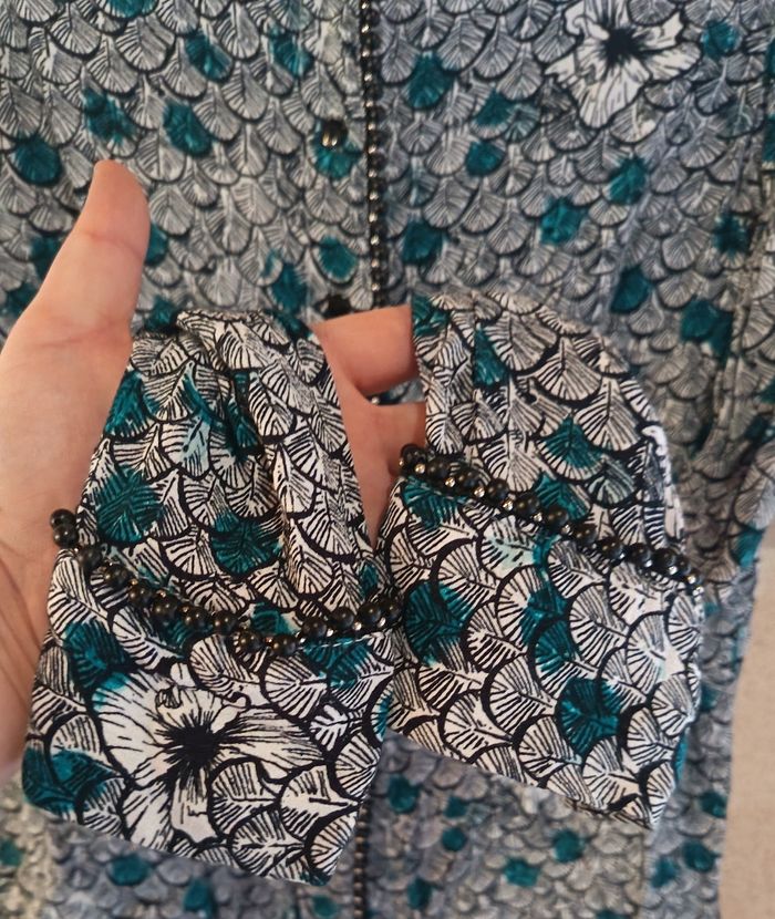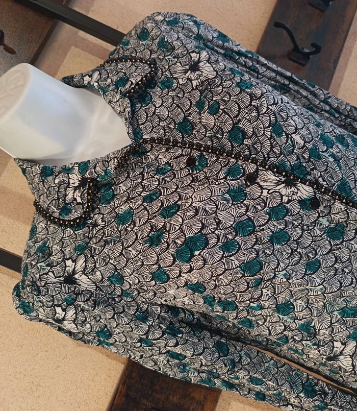 Détails chic : Le col, la patte de boutonnage et les poignets sont ornés de délicates perles noires et dorées pour une touche rock et élégante.
