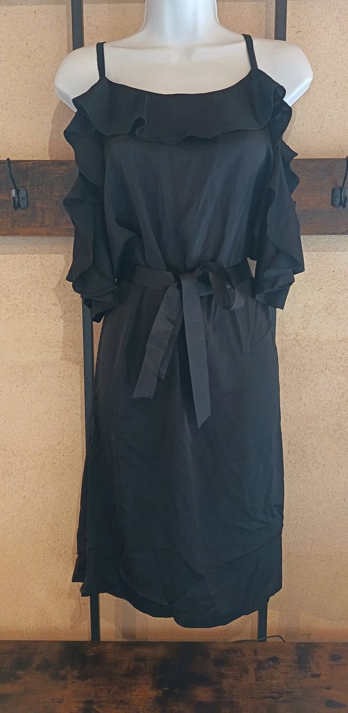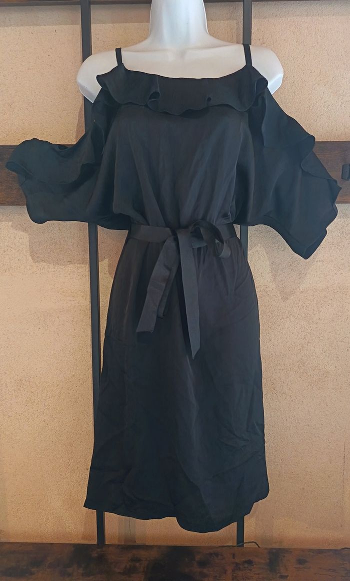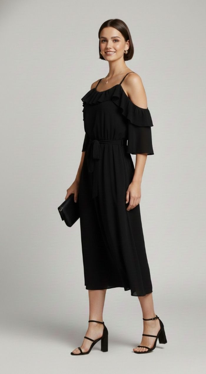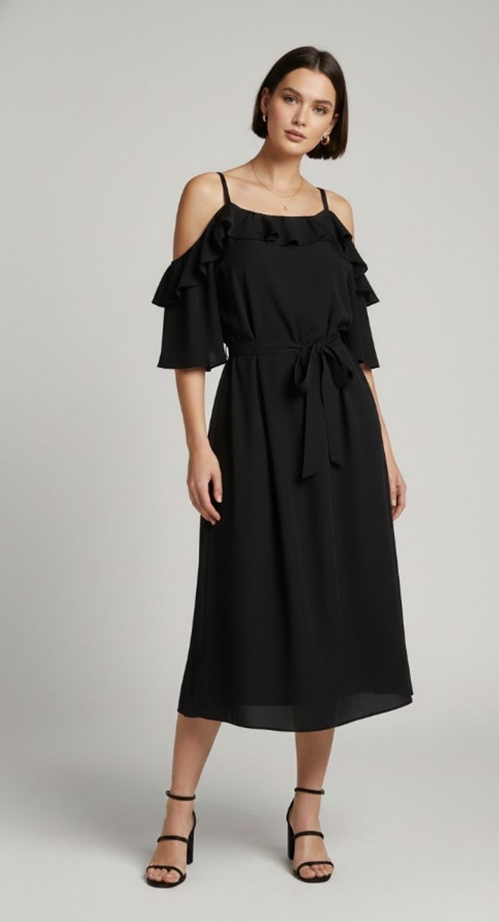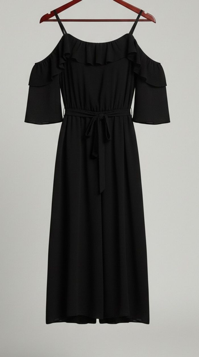 Coupe : Fluide et élégante, épaules dénudées avec volants (style "off-shoulder") et fines bretelles.