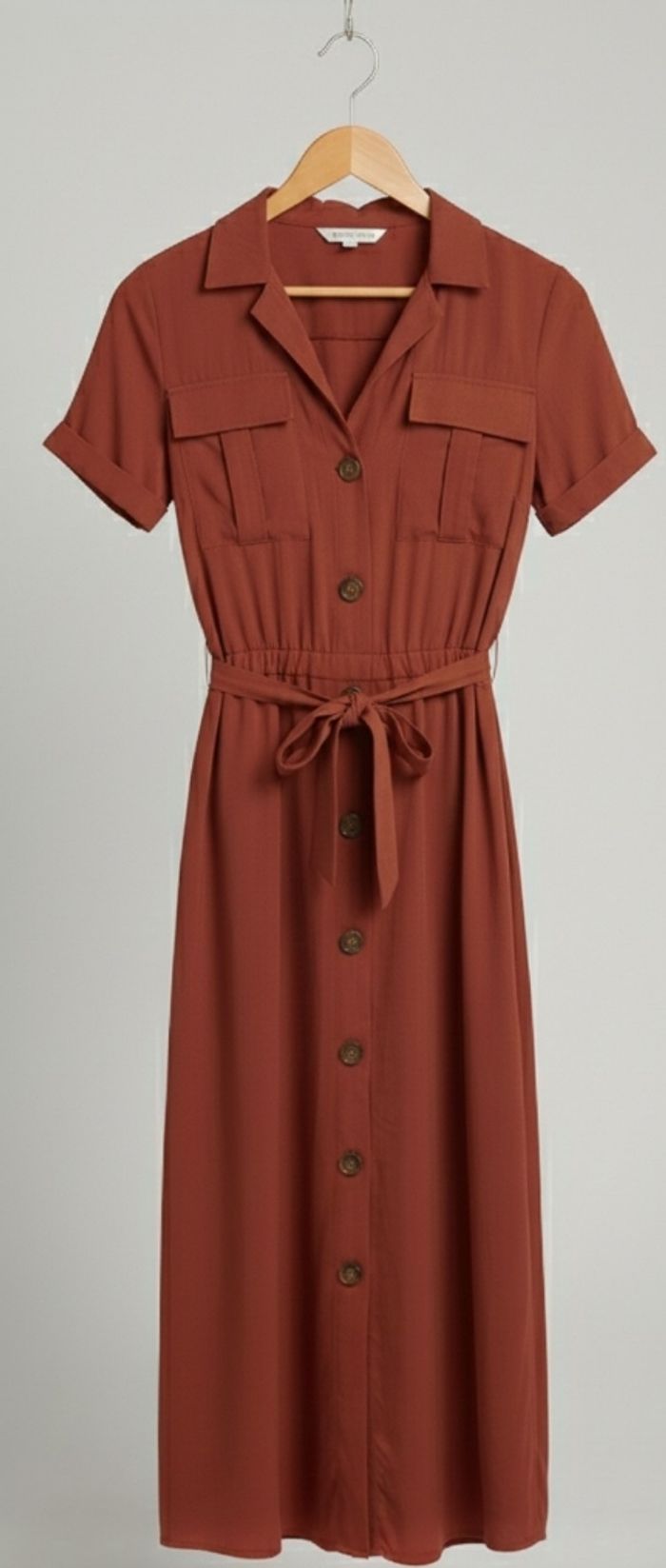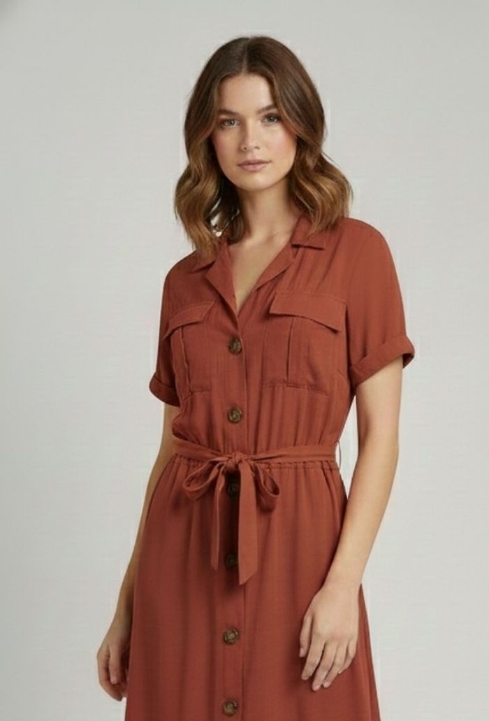 Détails : Style chemisier avec boutons, poches poitrine et ceinture à nouer pour marquer la taille.