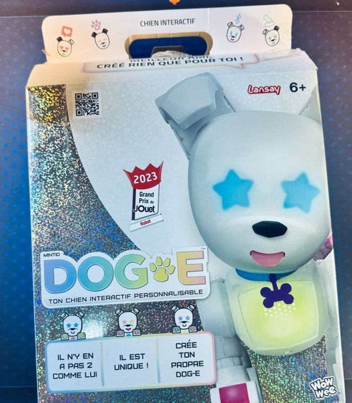Je vends le chien interactif Dog-E de la marque Lansay. Chien vendu avec le collier et sa médaille-pendentif + jouet os magnétique (voir photo) Description Découvre Dog - E, ton nouvel animal de compagnie ! Dog - E se comporte exactement comme un vrai chien : tu peux jouer avec lui, le promener avec sa laisse incluse, le nourrir, le caresser, et l’entendre émettre plein de sons ! À chaque fois que tu l’allumes, ton chien révèle une personnalité et des combinaisons de couleurs différentes, parmi les 35 millions de combinaisons possibles ! Utilise l’application smartphone pour personnaliser ton chien comme tu le souhaites et sauvegarde ta customisation ! Tu peux choisir la couleur de ses yeux, de ses pattes, de son cœur, de sa queue, et même son type de personnalité et son aboiement ! Place son jouet devant sa bouche pour le voir l’attraper et jouer avec, et place ton visage devant son museau pour le voir te lécher avec sa langue !