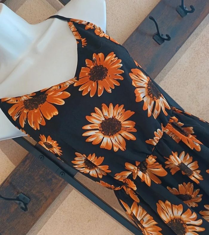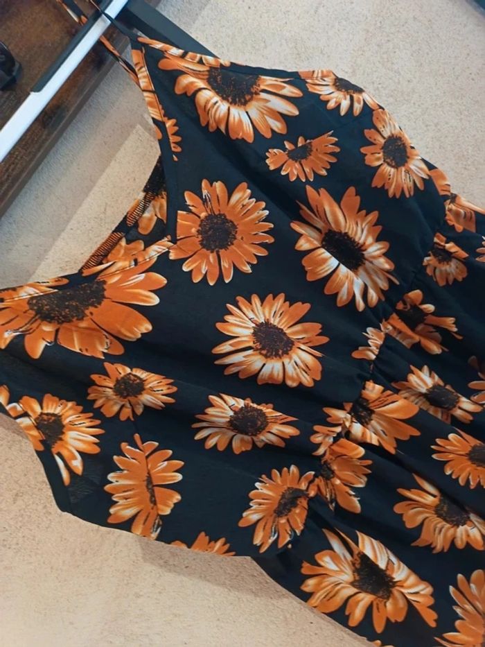 Ajoutez une touche ensoleillée à votre garde-robe avec ce joli top fluide ! Son imprimé tournesols sur fond noir offre un contraste élégant et moderne, facile à porter en toute occasion.