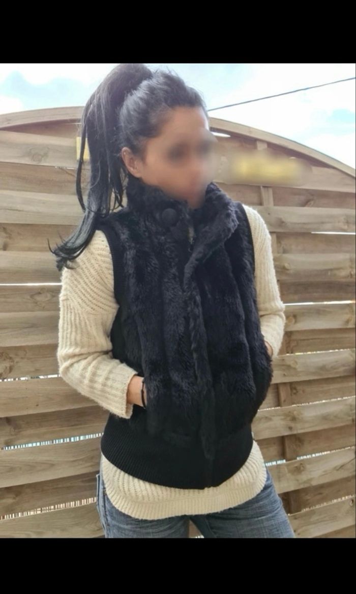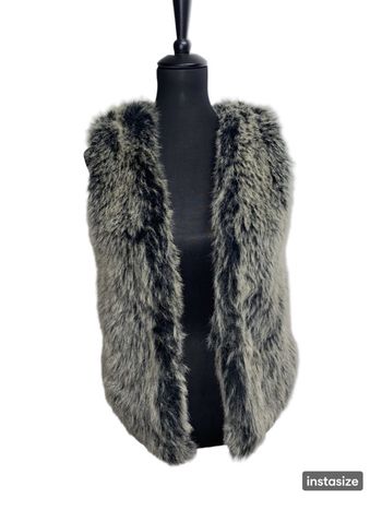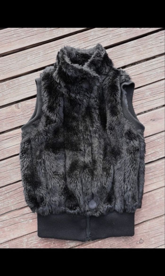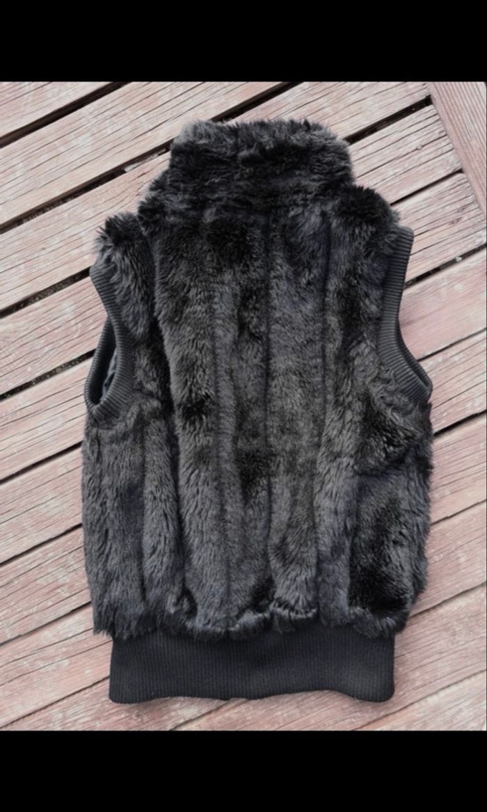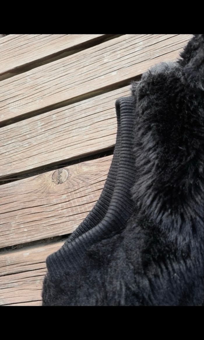 Veste sans manches fausse fourrure noire Deux poches plaquées latérales Col rond montant Fermeture par glissière et deux gros boutons Finitions bords côtes Toute doublée
