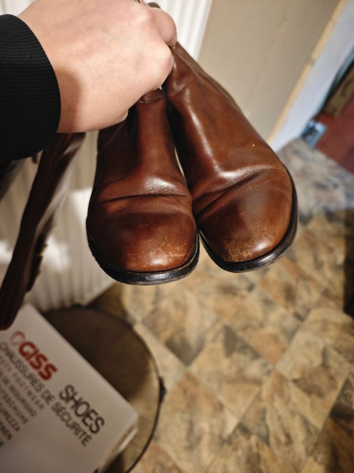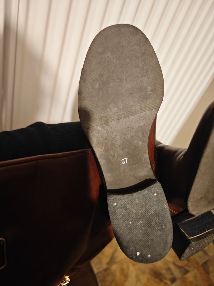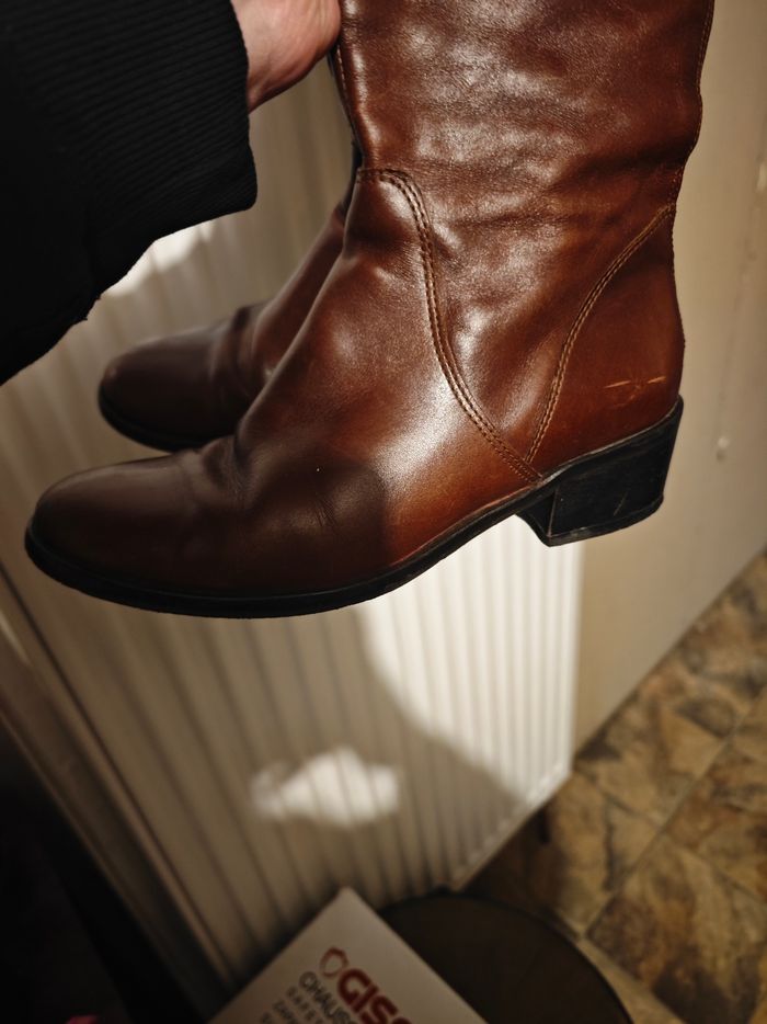Botte femme couleur marron Pointure 37 Fermeture éclair sur l'arrière des bottes Servi mais peuvent encore servir Des traces d'usures voir photos