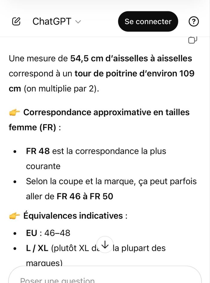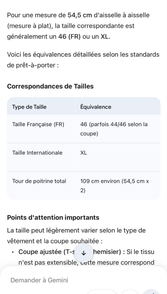 Mesure d’aisselle à aisselle:54,5cm=109cm de tour de poitrine.