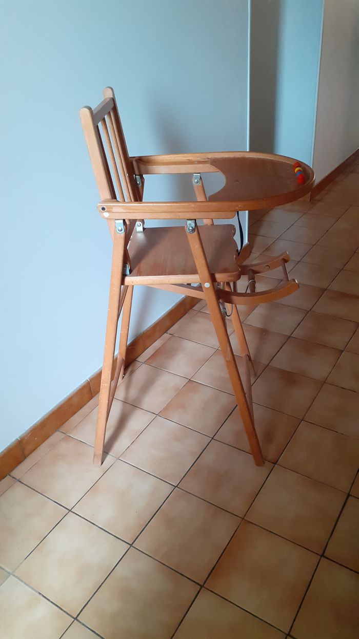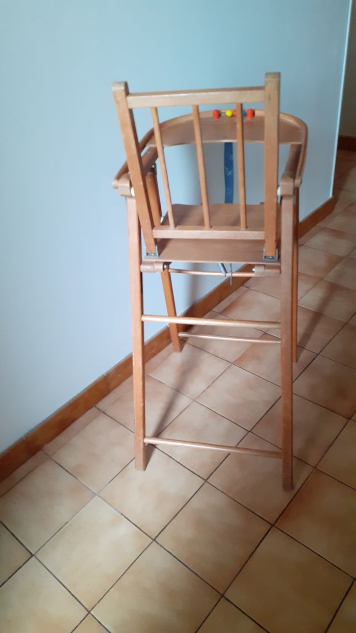 Vends une chaise haute pour bébé avec repose pied. Hauteur : 94 cm Largeur au niveau des pieds : 40 cm Profondeur : 45 cm. Ne se plie pas. A voir et à récupérer sur place à Grisolles.