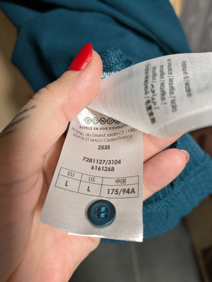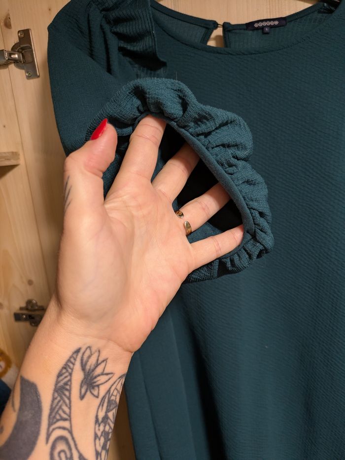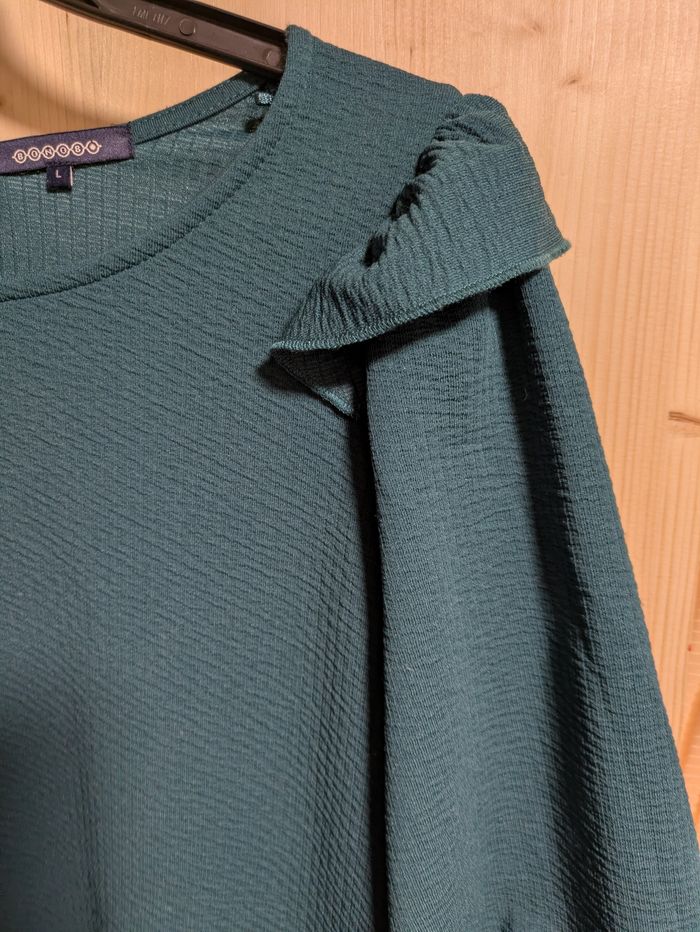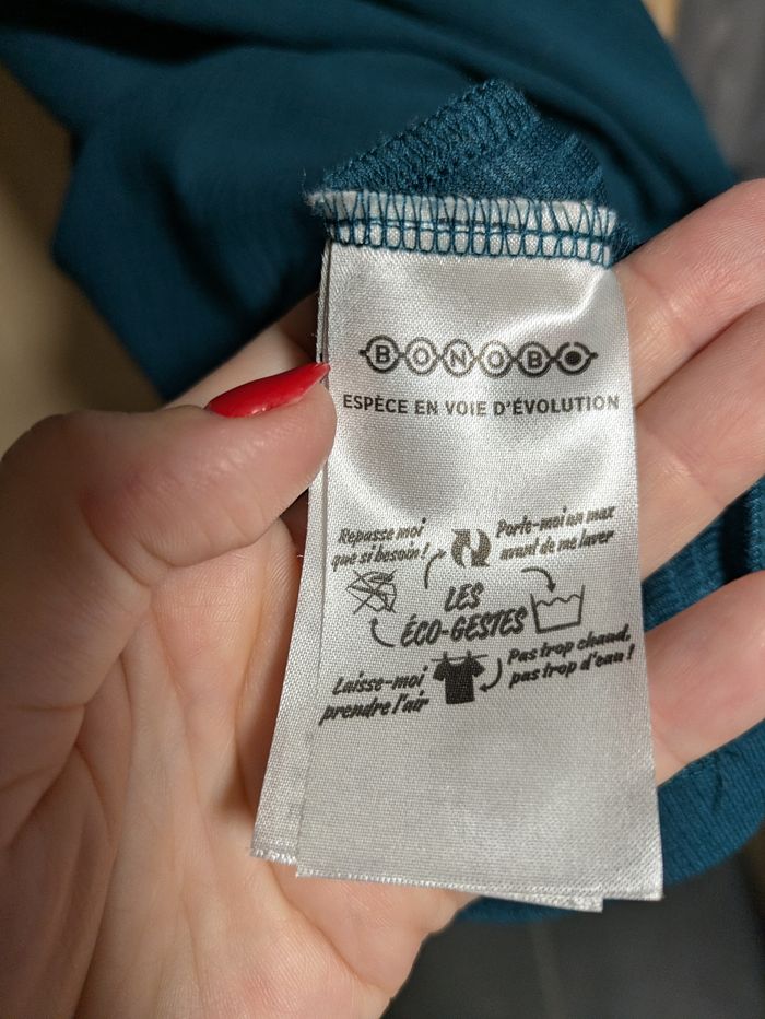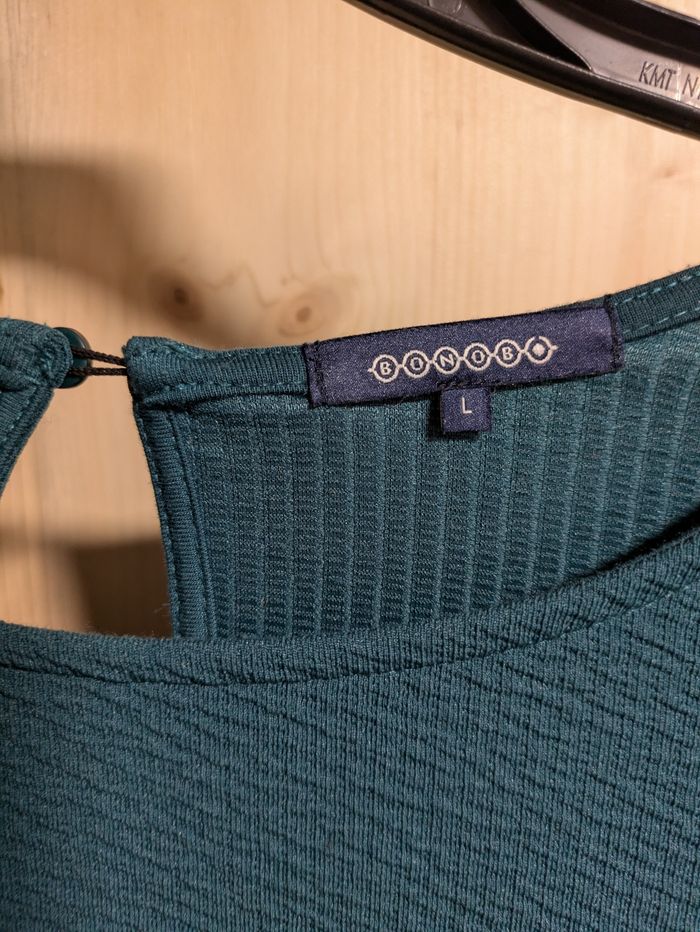 Vend magnifique robe de chez Bonobo. Taille L. Coupe droite. Manches 3/4 bouffantes. Couleur bleu / vert canard. Parfait état. Envoi rapide